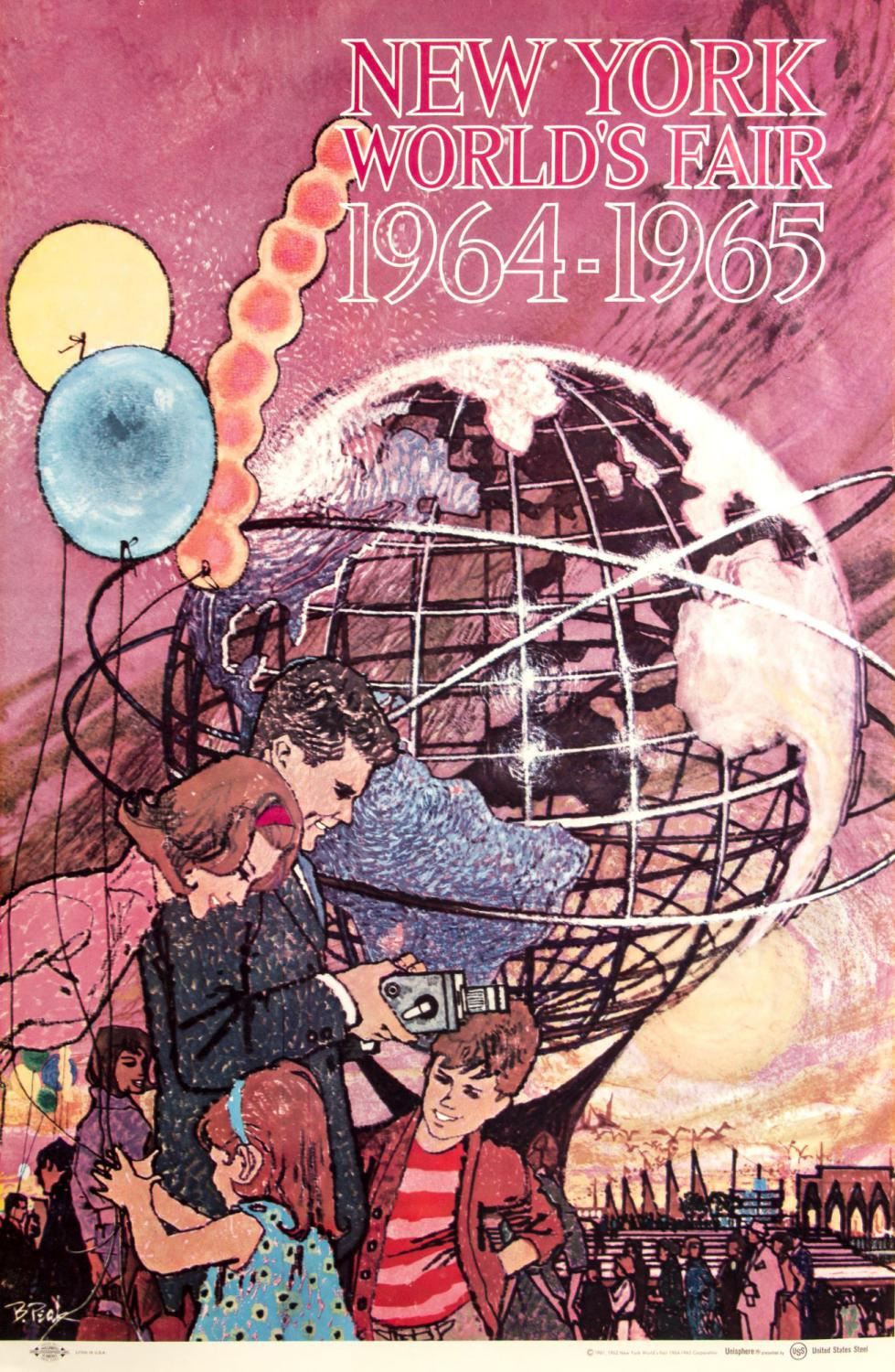 (World's Fair, 1964) A beautiful lithographic poster promoting the 1964-1965 World's Fair. This iconic artwork was created by established Hollywood artist Bob Peak and measures 43"x28". The condition is good with a slight waviness to the paper, and the poster is adhered to a foam core backing.