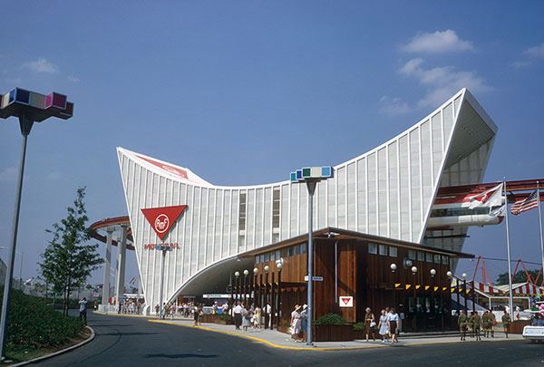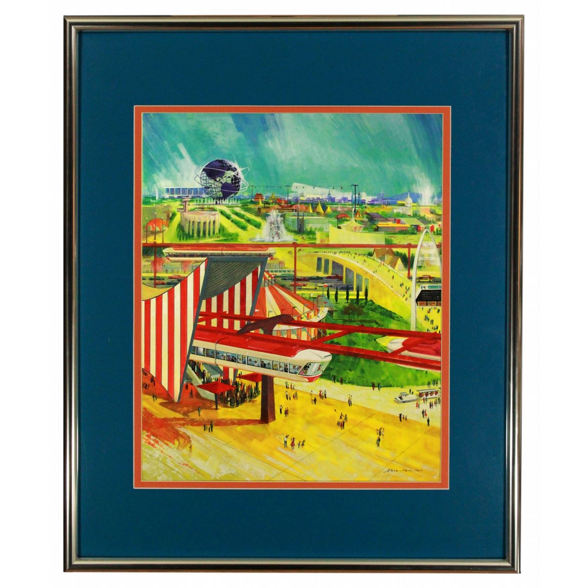 (World's Fair 1964) Absolutely beautiful original concept painting of the 1964 fairgrounds focusing on the AMF Monorail with the Unisphere in the distance.