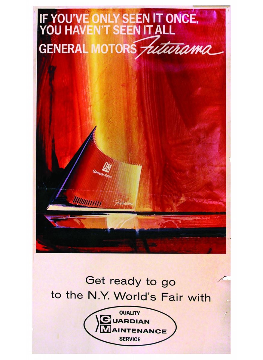 (New York World's Fair, 1964) An extremely rare promotional poster for General Motors presentation of “FUTURAMA”! A striking image from this iconic pavilion that went toe-to-toe with Ford Motor Company’s presentation of Walt Disney’s “Magic Skyway”…the two titans at the Fair! This huge poster is for the under-sponsor, Guardian Maintenance. The poster is in need of restoration, however, it is well worth the effort as any artifacts of his mind-altering attraction at the Fair are hard to come by. Measuring 70" x 38" and in Fair-Good Condition. General wear with some creasing, tears and a half inch bit of paper loss away