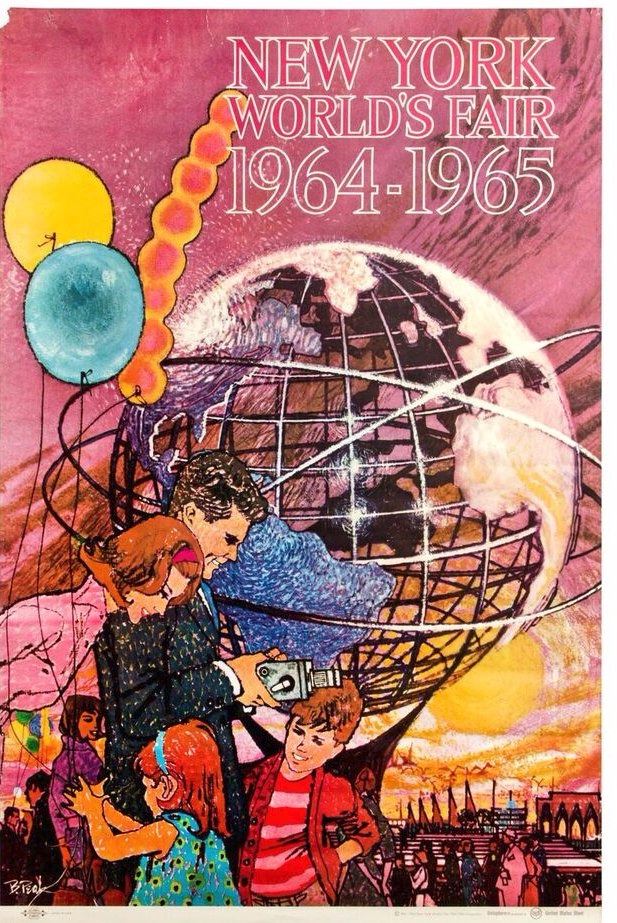 (World's Fair, 1964) A stunning large poster for the 1964-65 New York World's Fair. This lithographic poster, designed by Robert Peak, measures 42.5"x28" and is in good condition with some wear throughout including a waviness to the paper and few thin tears in the top edge.