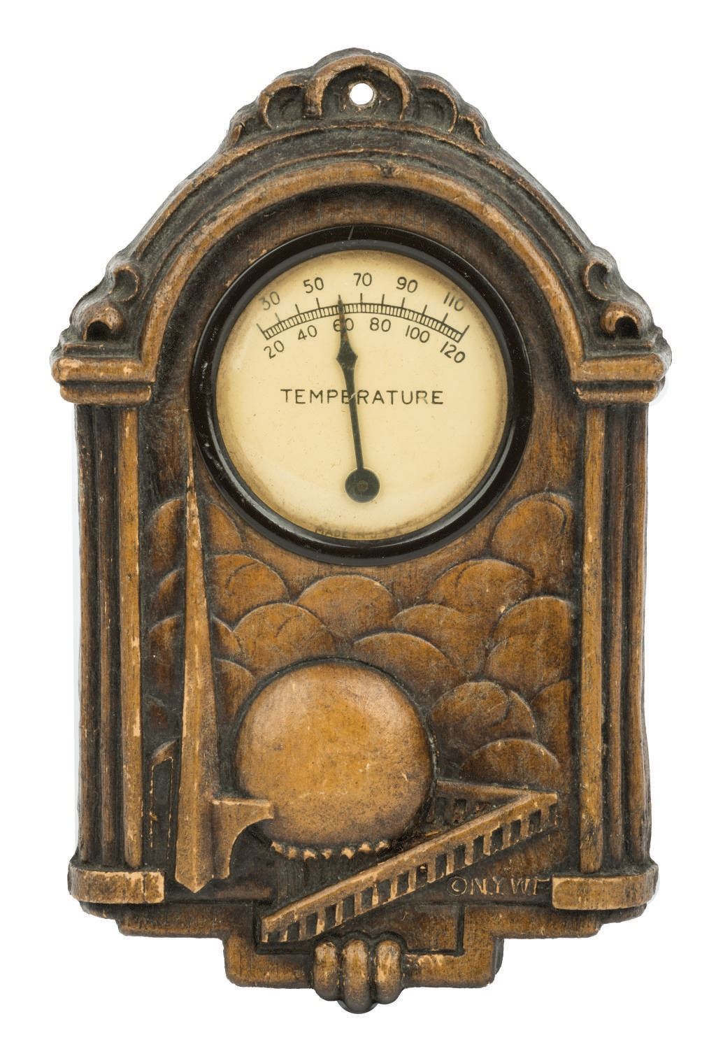 (Syroco, 1939) A 1939 New York World's Fair Syroco wood wall thermometer. Measuring 5.5"x3.5", the piece is in very good condition with very light wear from display.