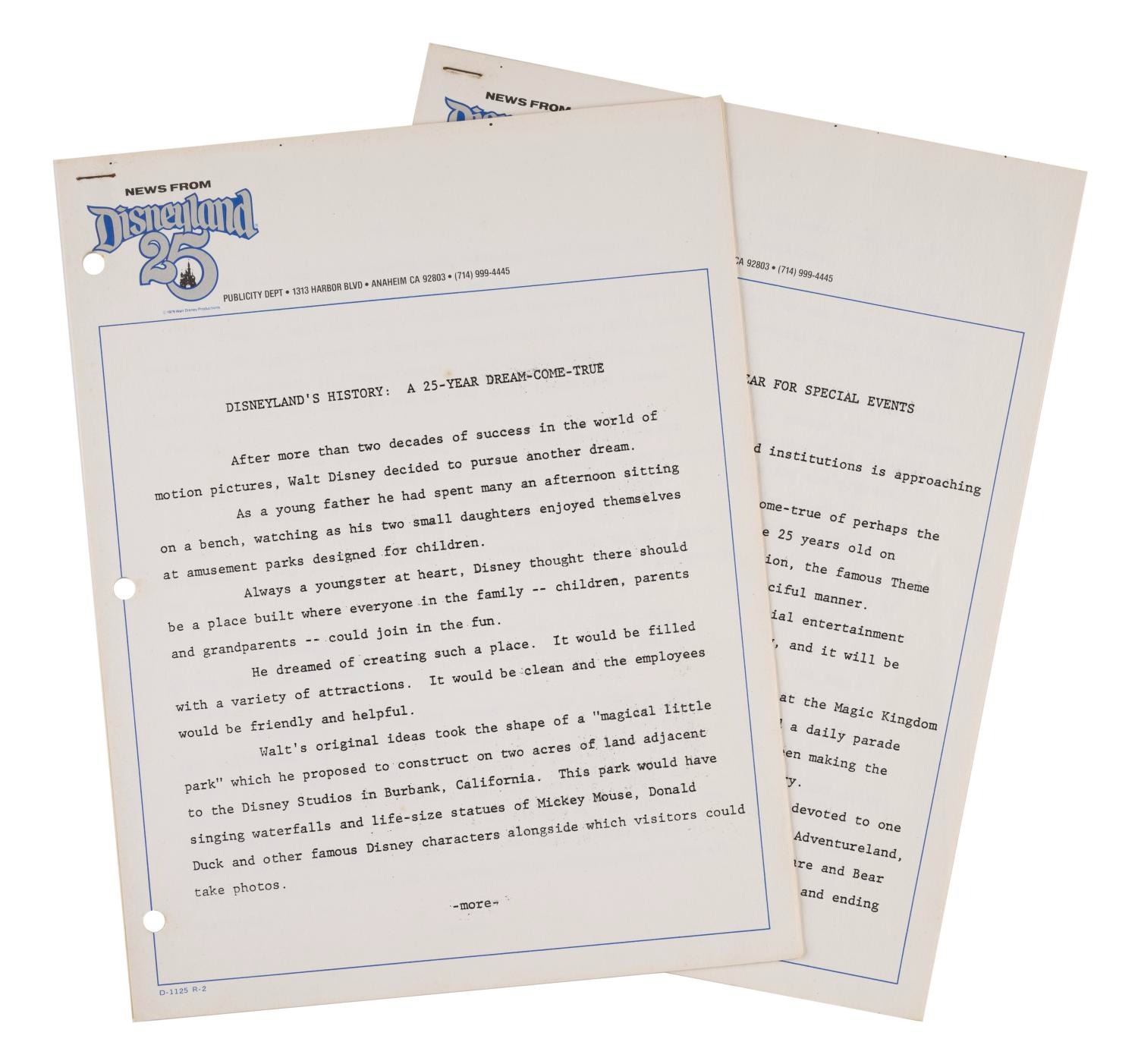 (Disneyland, 1979-80) A collection of News From Disneyland Publicity Department releases announcing the Disneyland Silver Anniversary. Measuring 8.5” x 11”, each page is in very good condition with minor wear.