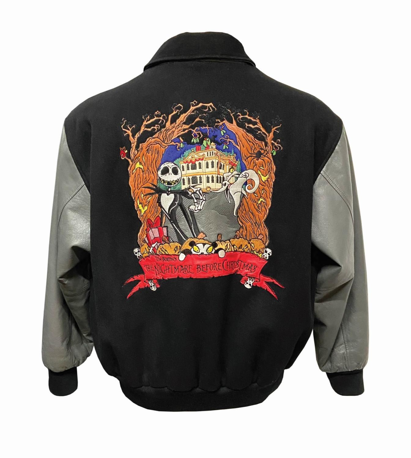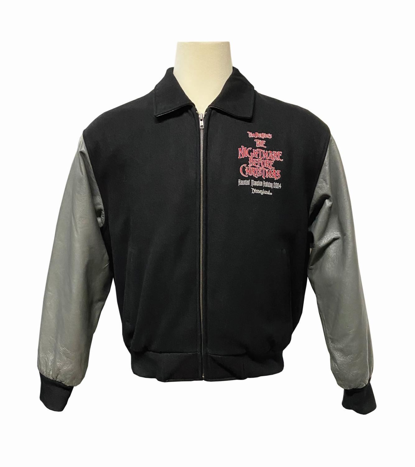 (Disneyland, 2004) A rare limited edition Nightmare Before Christmas Haunted Mansion Holiday collared letterman jacket created for the 2004 festive season. The black wool jacket features gray leather sleeves and a zipper closure. "Tim Burton's The Nightmare Before Christmas Haunted Mansion Holiday 2004 Disneyland" is embroidered on the left chest, and the back boasts a large leather and silk thread embroidered graphic depicting Jack Skellington and Zero outside the mansion, which is trimmed with Yuletide decorations. The interior retains the original Disneyland Resort label, with size "L" tab. The jacket remains in fine, unworn condition. The Disneyland label has discolored from contact with the black wool.