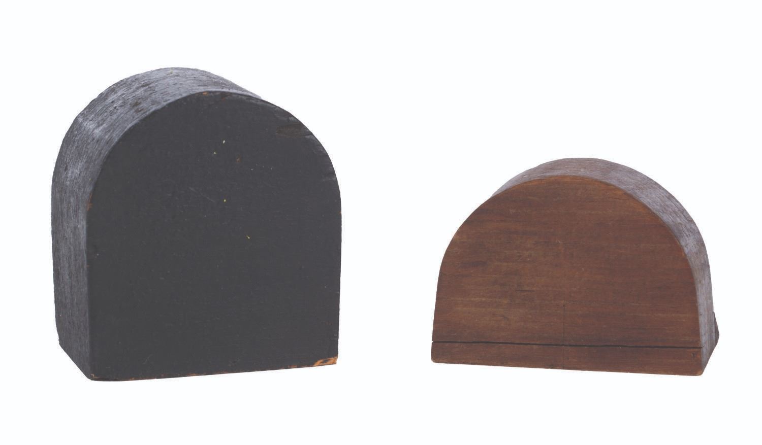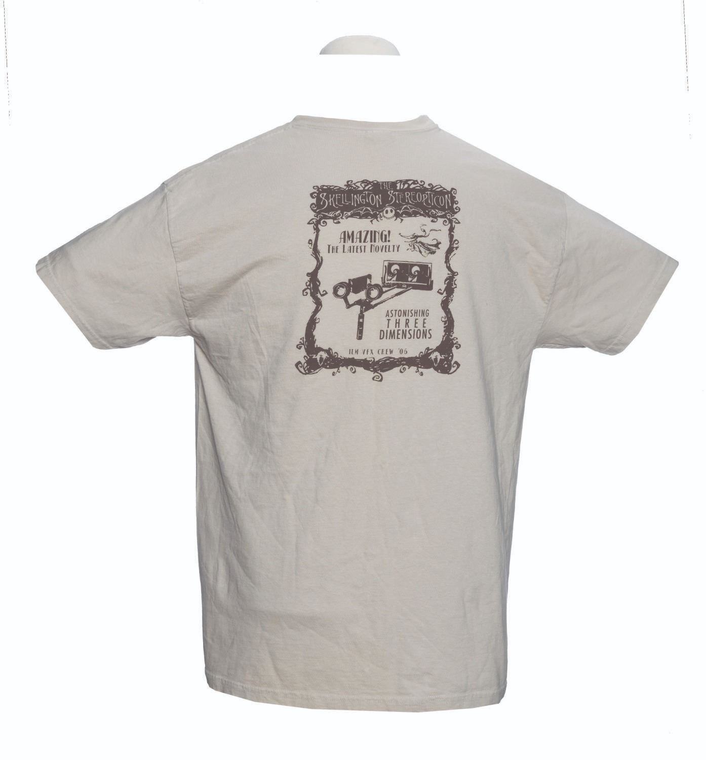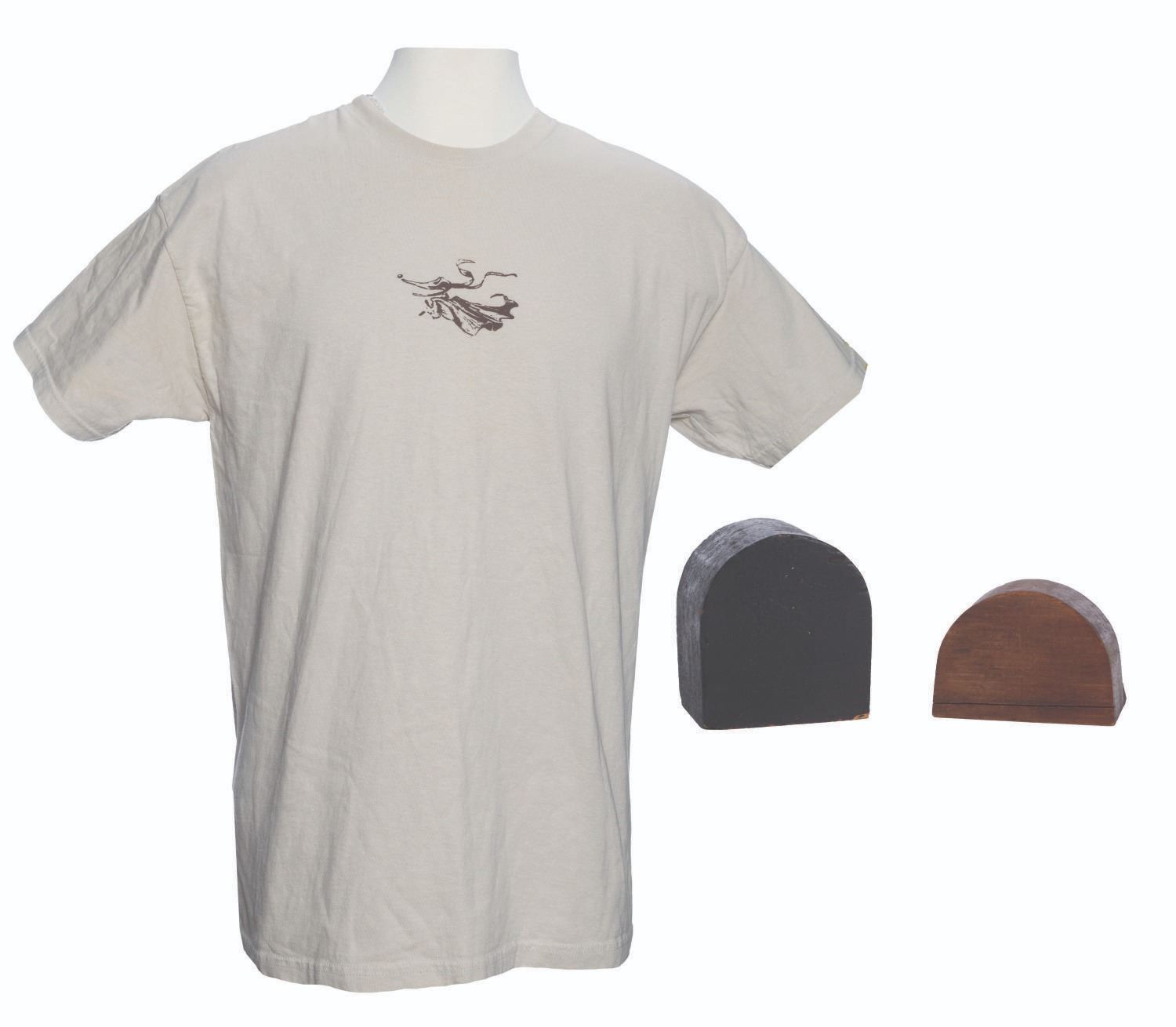 (ILM, 1993, 2006) A pair of gravestone prototypes and a gift T-shirt to the Industrial Light & Magic Visual Effects Crew who worked on" Tim Burton's The Nightmare Before Christmas 3-D." Measuring a size extra large, 1.75"x2"x1.25", and 1.75"x1"x1.5", each piece is in very good condition with minor wear to the wooden prototypes from production use.