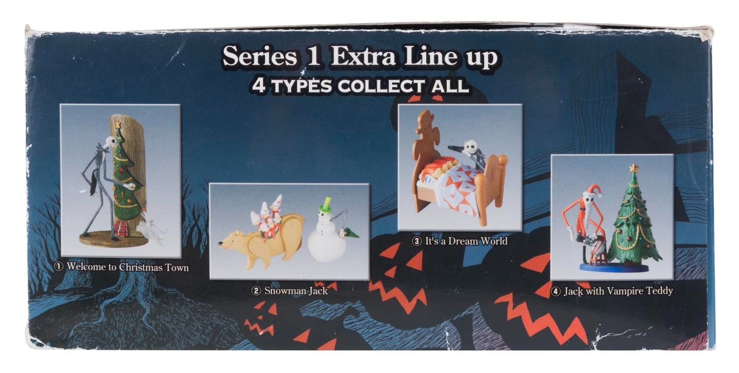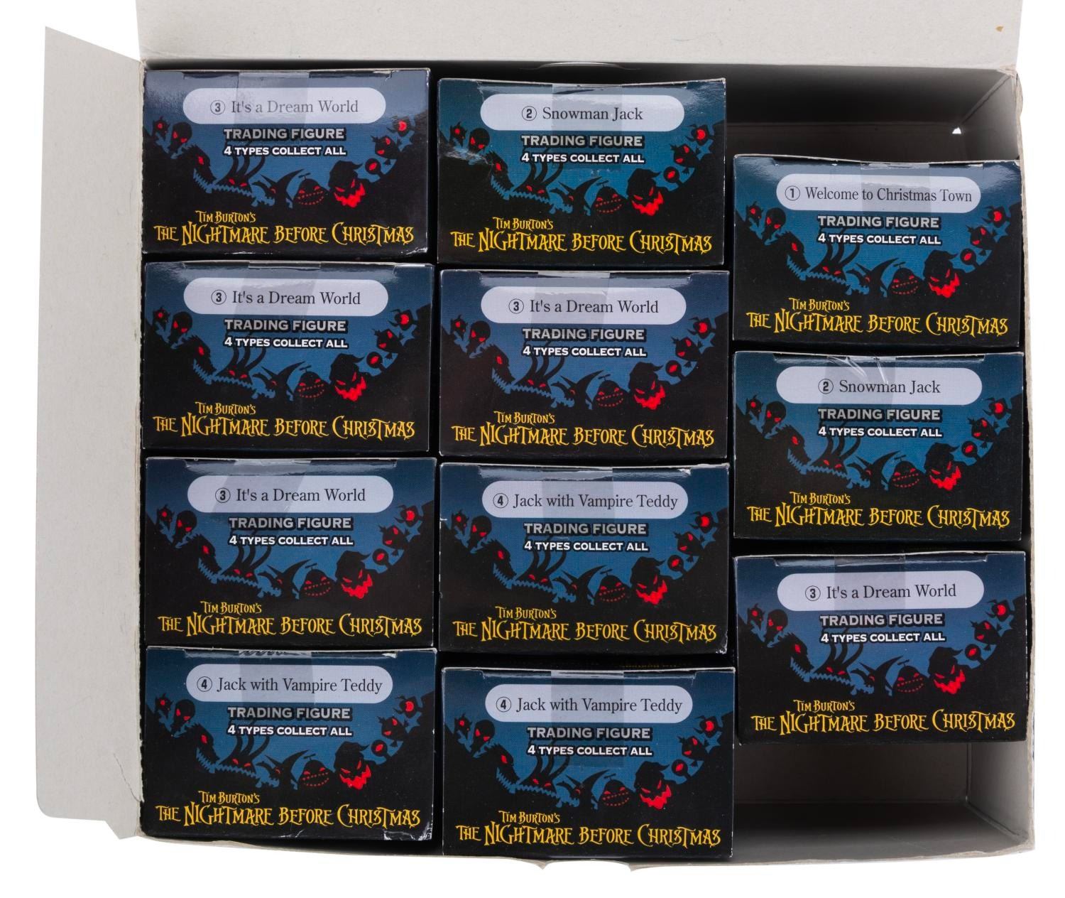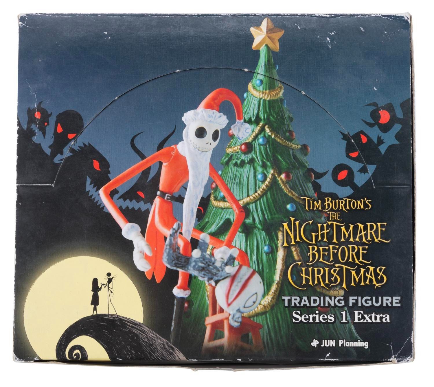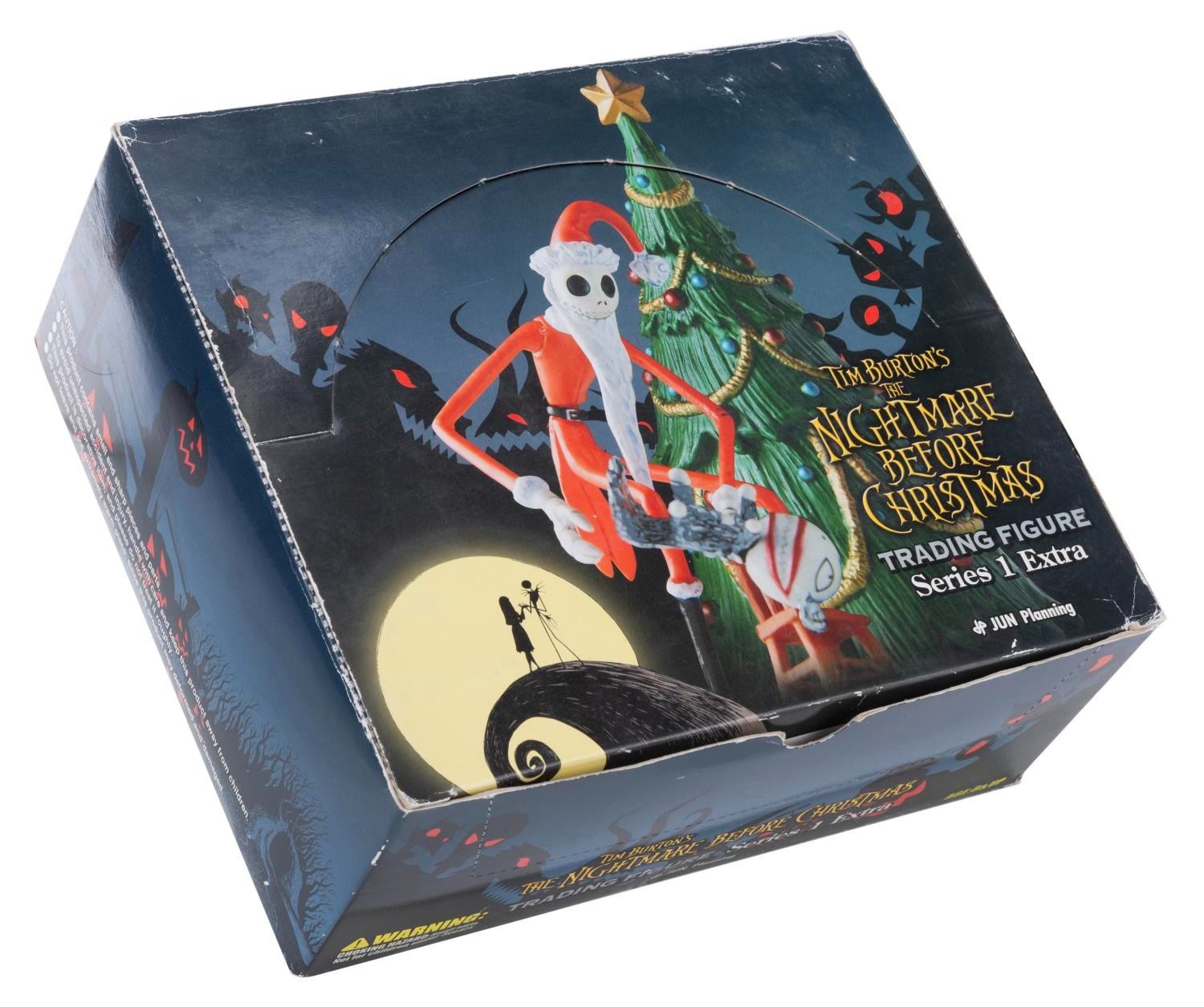 (JUN Planning, 2000s) A countertop display case with 11 “Tim Burton’s The Nightmare Before Christmas” Series 1 Extra trading figures. Of the four designs in the line, included are one of “Welcome to Christmas Town,” two of “Snowman Jack,” five of “It’s a Dream World,” and three of “Jack with Vampire Teddy.” The boxes containing the 1.5” to 3” tall figures measure 3.5” x 2.75” x 1.75” deep and are in fine, unopened condition. The display box measures 3.5” x 7.5” x 8.5” deep and is in good condition with wear to the top, edges, and corners.