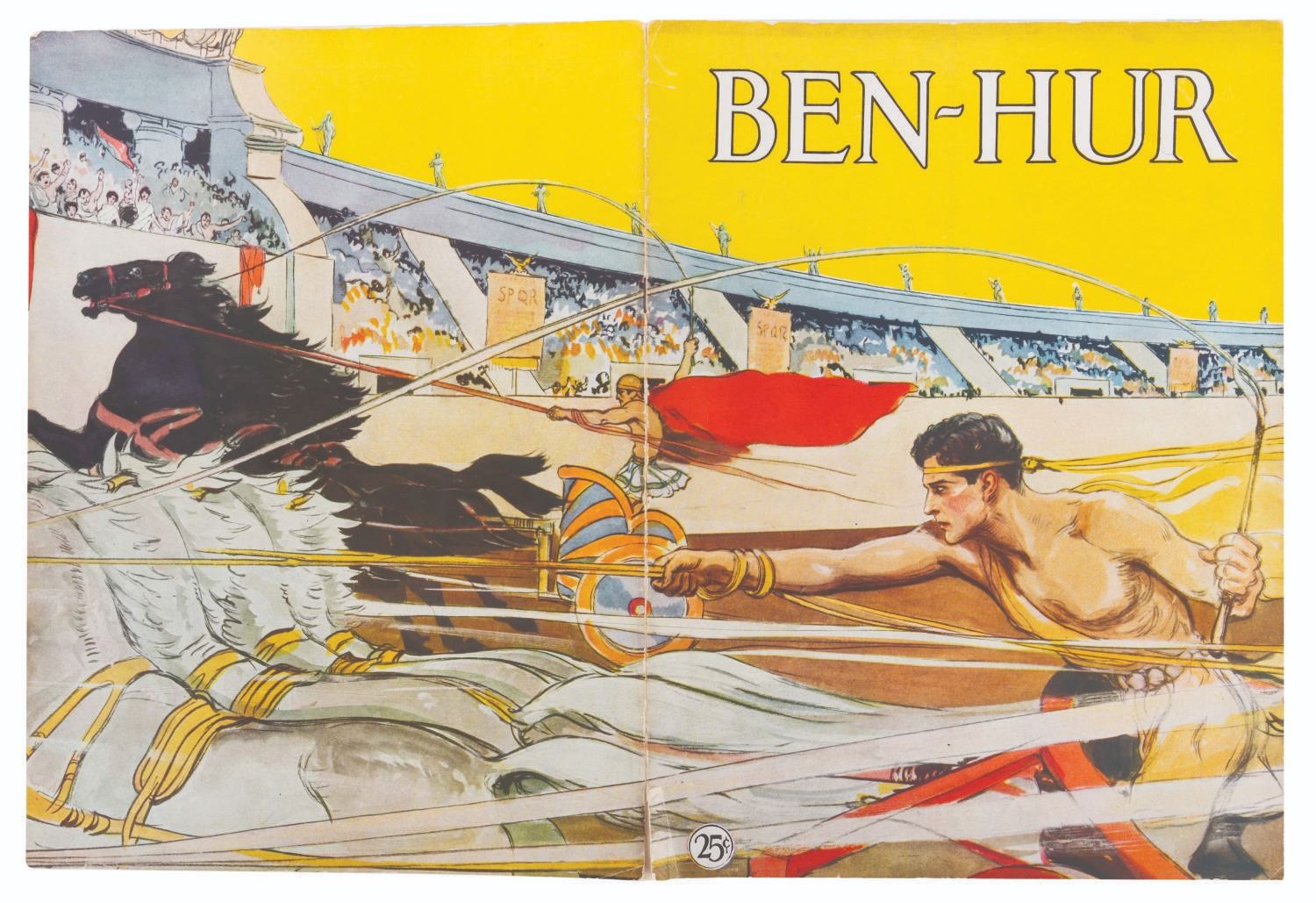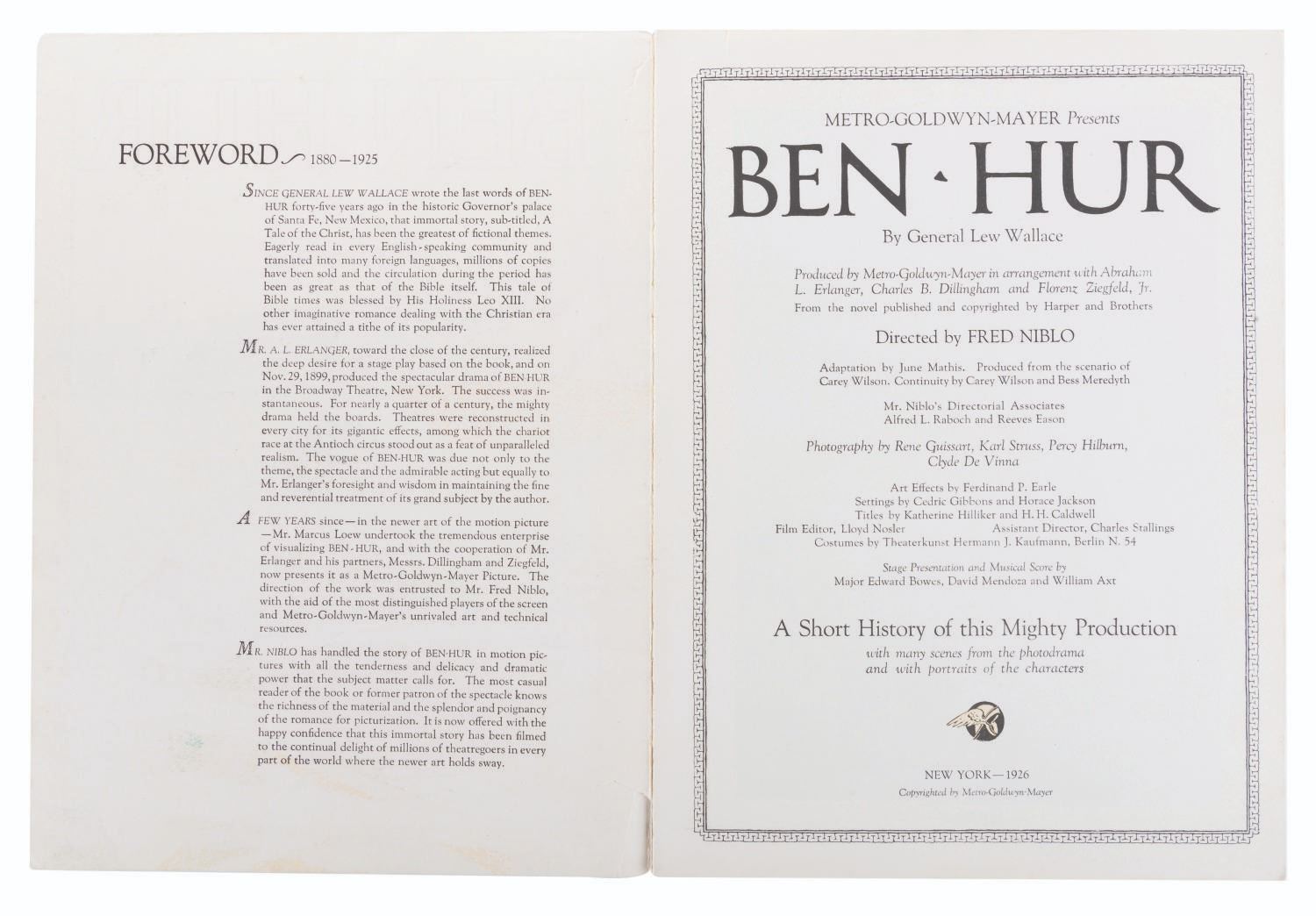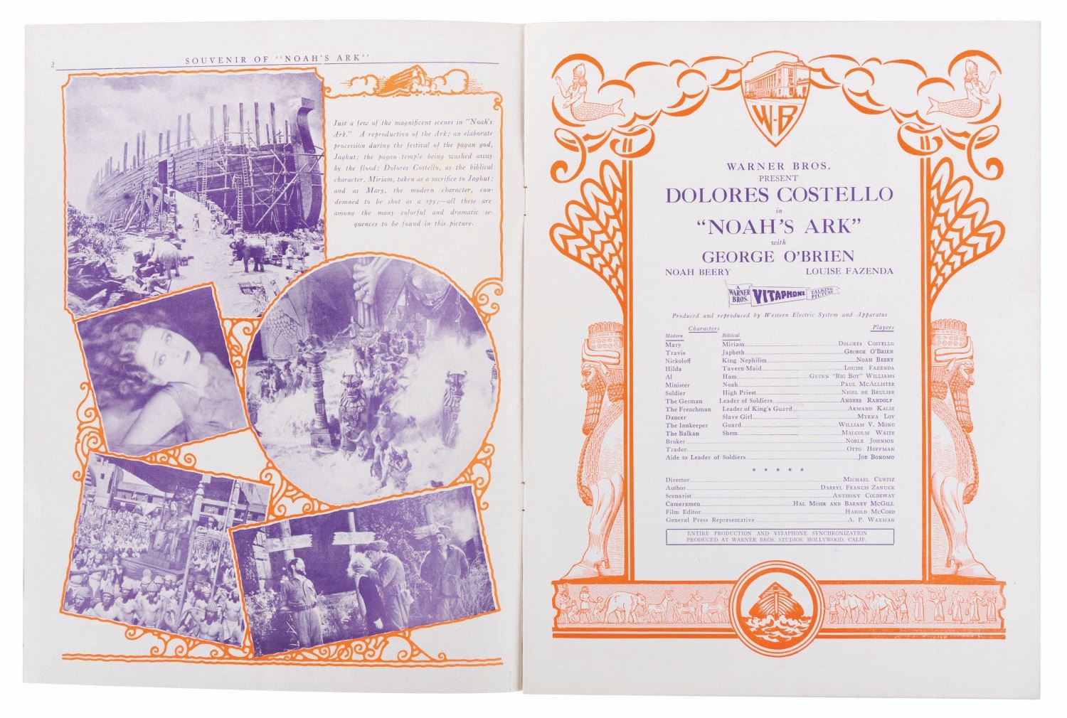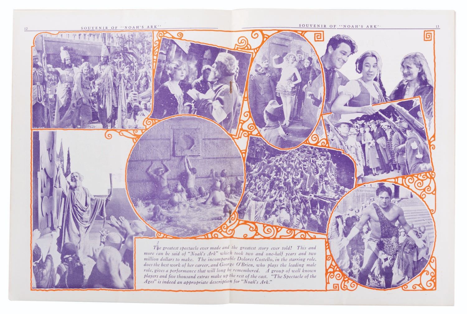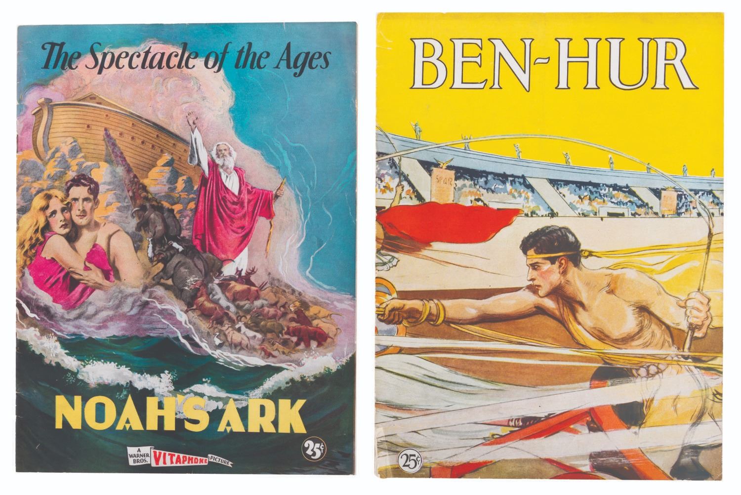 (MGM/Warner Brothers, 1926/1928) A pair of souvenir programs for the film spectaculars "Ben-Hur" from 1926 and "Noah's Ark" from 1928. Measuring 9" x 12" each, the "Noah's Ark" program is in very good condition with edge wear and a slight center crease, and the "Ben-Hur" program is in good condition with edge wear, scuffs, and separation of the spine at the top and bottom.