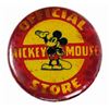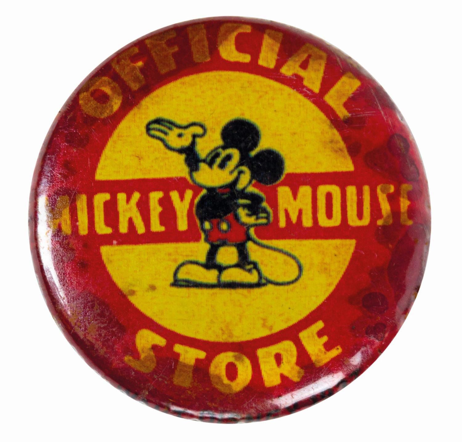 (Kay Kamen, 1937) A vintage Official Mickey Mouse Store button manufactured by Kay Kamen, Ltd. The pin back button features an image of a smiling Mickey Mouse with his arm raised as if making a presentation. The rim of the button reads, "Walt Disney 1937," and a paper insert over the metal backing is printed, "Kay Kaymen Ltd New York London." Measuring 1.25" in diameter, the button is in fair condition. The face exhibits some damp staining. The metal on the reverse is heavily oxidized and the stick pin is bent.