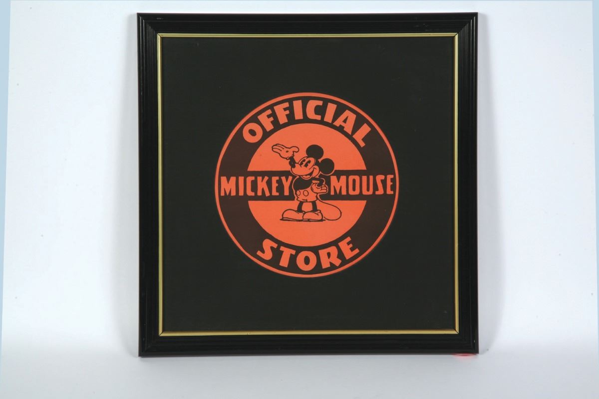 (Walt Disney Studios, c. 1935) For the first few years, these display signs featured Mickey sporting a Mickey Mouse Club button, and were given to stores that either supported the Mickey Mouse Clubs or sold Mickey merchandise. When the clubs were officially disbanded, the Club Button was removed from the sign and the sign was used solely for stores selling Mickey Mouse merchandise. The blacked-out shape of where the button would have gone still remains on the sign. Measures 15"x15" framed, with the sign itself measuring 11"x11". Appears to be in very good condition, with minor scuffing to the frame. Uninspected out of frame.
