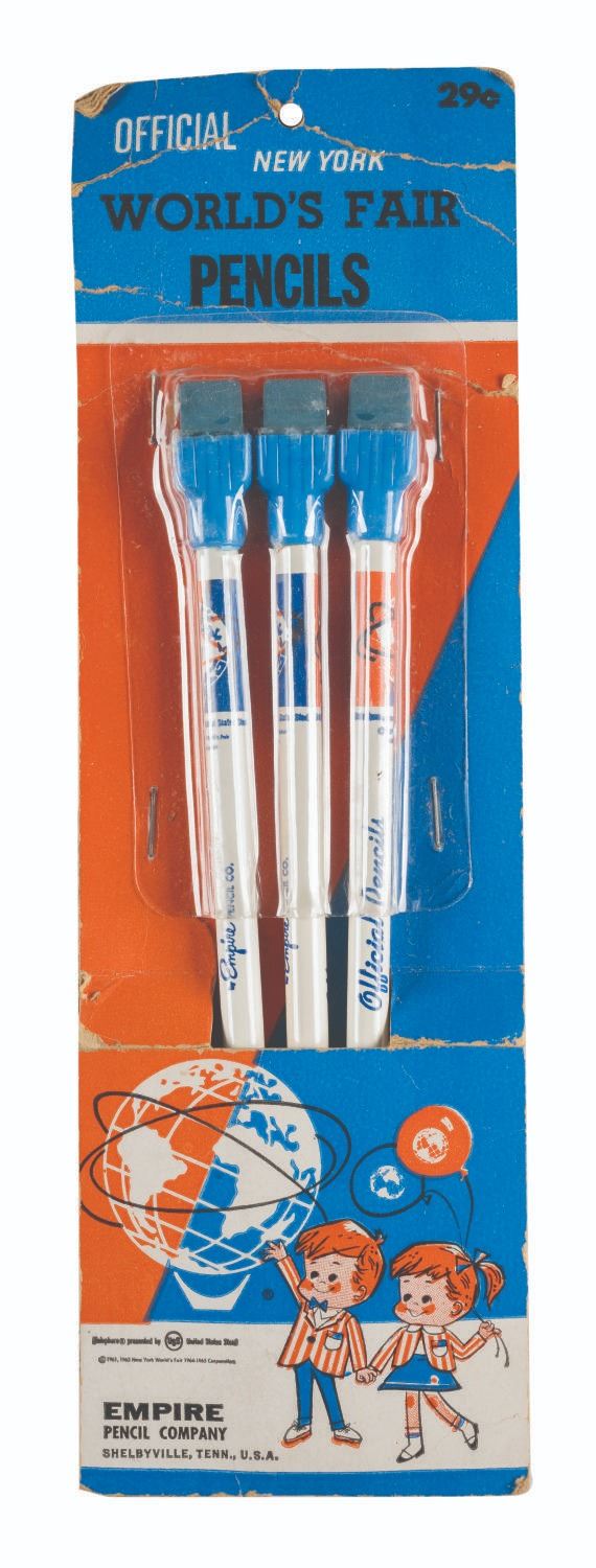 (World’s Fair, 1964/65) A three-piece Official New York World’s Fair Pencils set by Empire Pencil in the original packaging. Measuring 3.5” x 10.5”, the package is in good condition with creases and edge wear throughout. The sealed pencils are in presumed fine condition.
