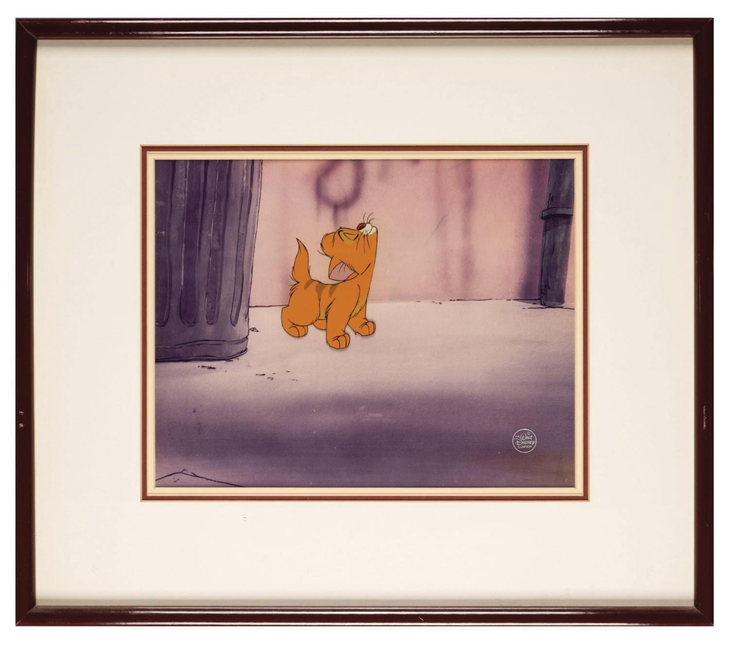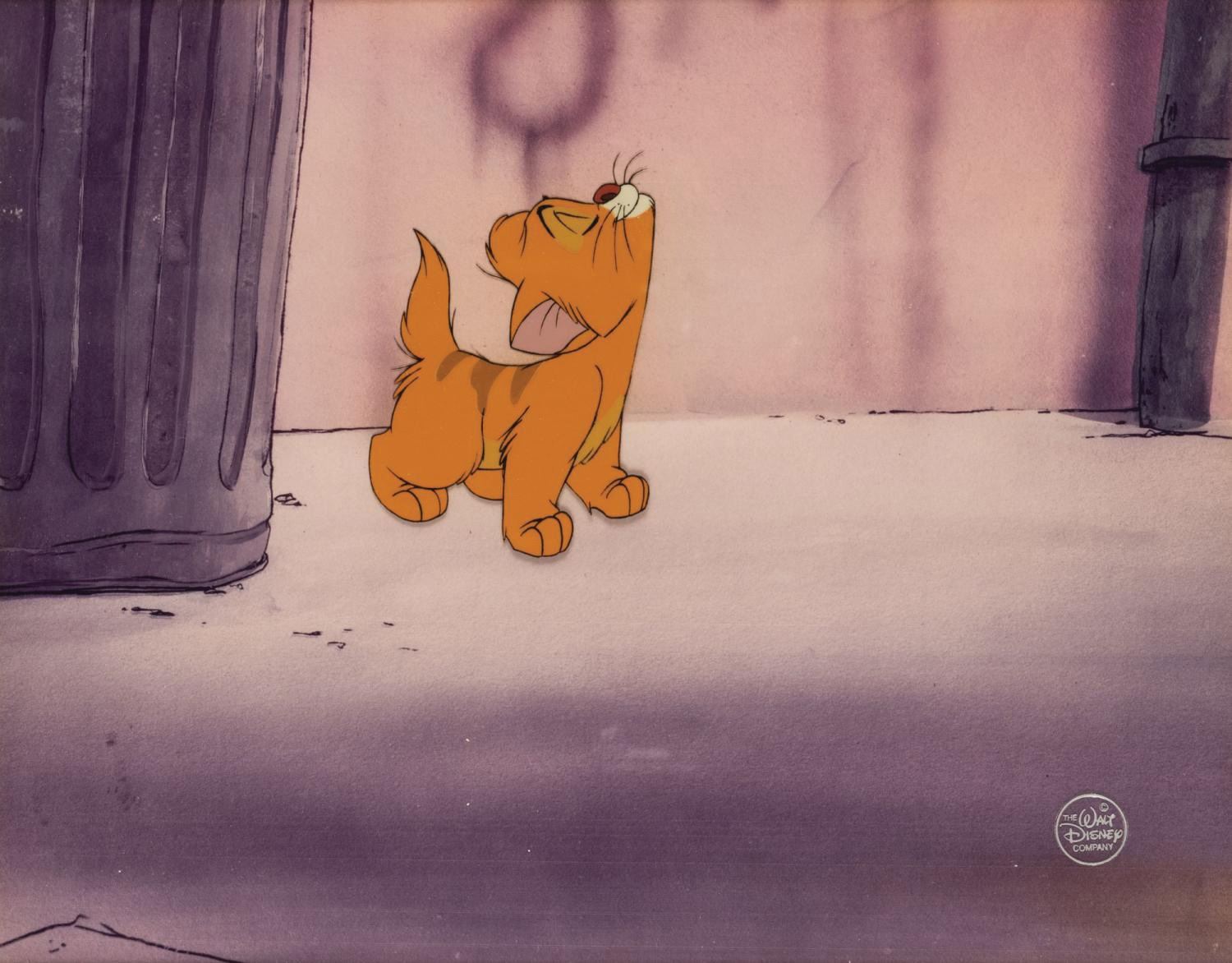 (Disney, 1988) A production cel of Oliver from Walt Disney Pictures' Oliver & Company. The cel includes a full-body depiction of the titular Oliver strutting his stuff, and getting the feel of the New York City streets. It is displayed over a scene-matching printed background. The piece has a 9"x11.75" mat opening within its 17"x19.5" frame. The painted character size is 3.75"x2.5". The cel is in very fine condition and bears The Walt Disney Company insignia in the bottom-right. It comes with the Studio's certification slip on the reverse.