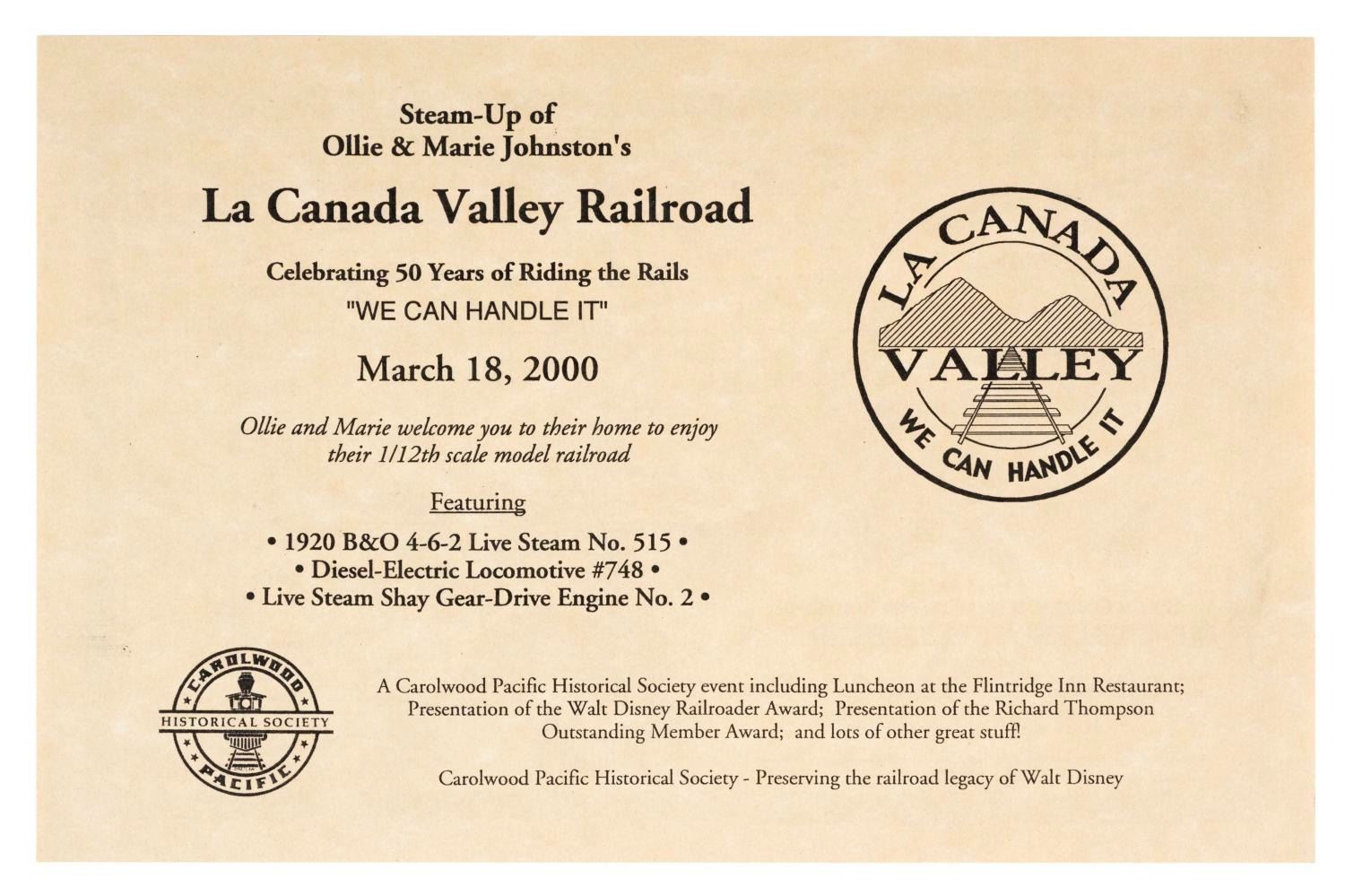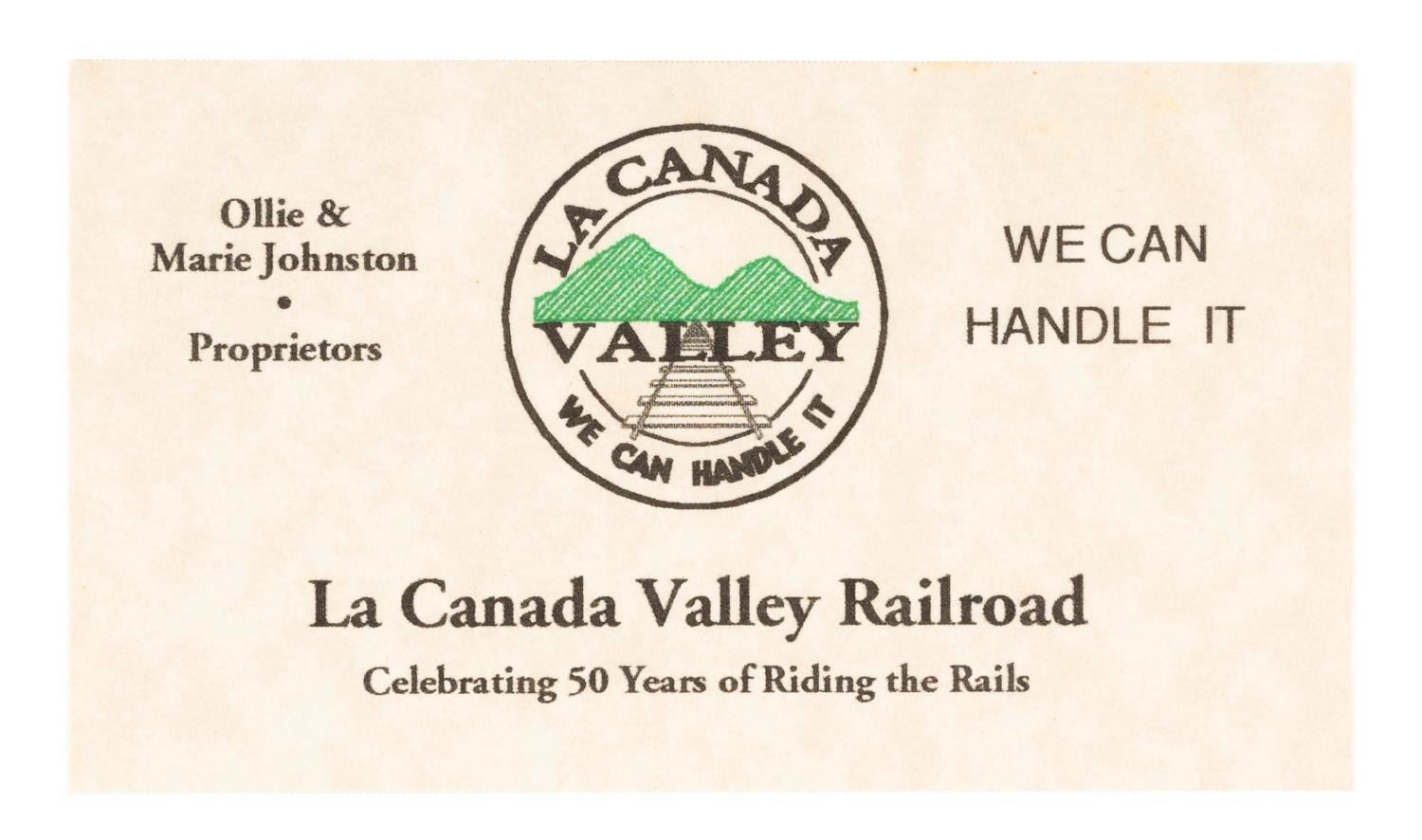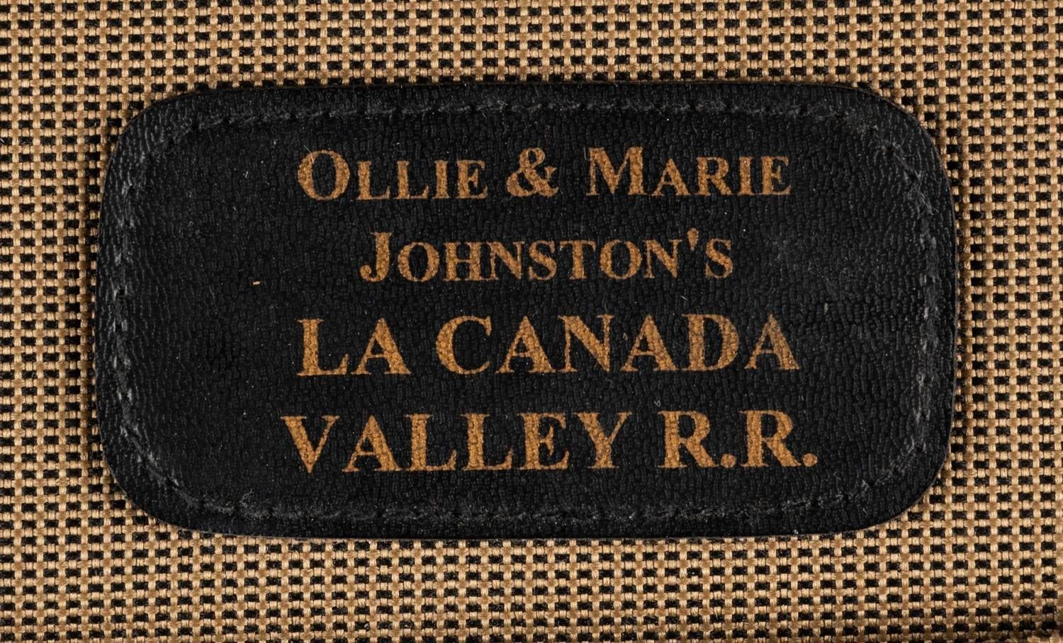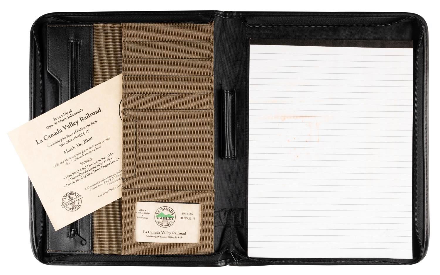 (Johnstons, 2000) An Ollie & Marie Johnston’s La Canada Valley Railroad padfolio from their celebration of 50 years “riding the rails.” Included inside is a business card, an invitation, and a notepad. Measuring 10” x 13”, the padfolio is in very good condition with light wear and stains on the first few pages of the notepad.
