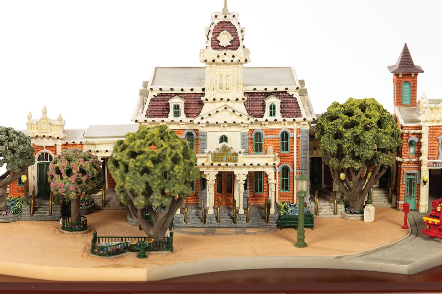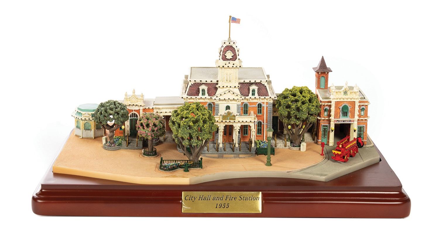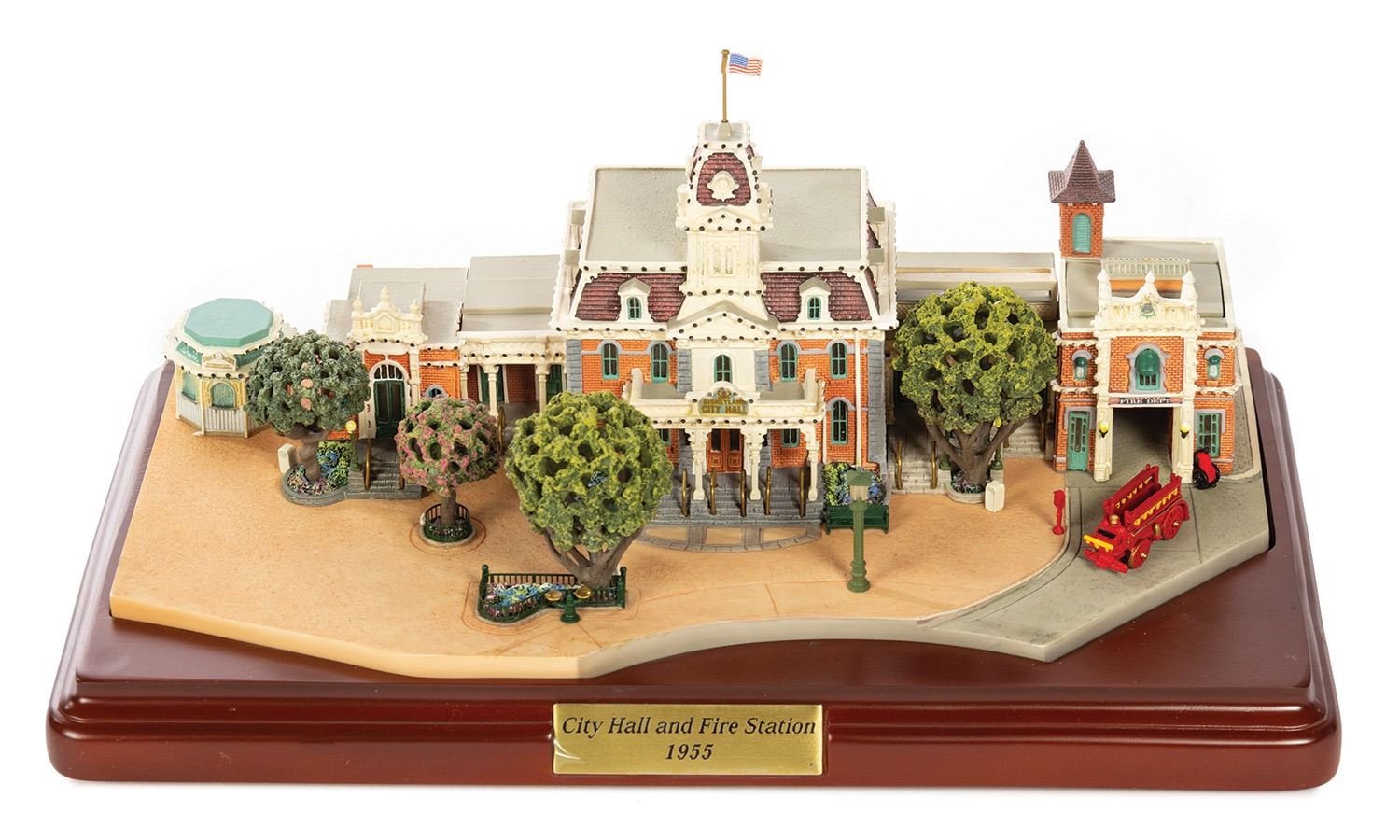 (Disneyland, 2004) A beautiful scale model of Disneyland's City Hall and Fire Station on Main Street. The model was created by renowned miniaturist Robert Olszewski for his very popular Main Street U.S.A. collection of models. The model has lighted elements that are powered by a battery compartment in the base, and comes with its original box, power cord, as well as loose fire hydrant, roof and fire truck figures. Measuring 5.5"x10" and approximately 3" tall, the model is very good condition. The roofs have crazing throughout, as is very common with these delicate models. A flag is missing and the box has wear throughout.
