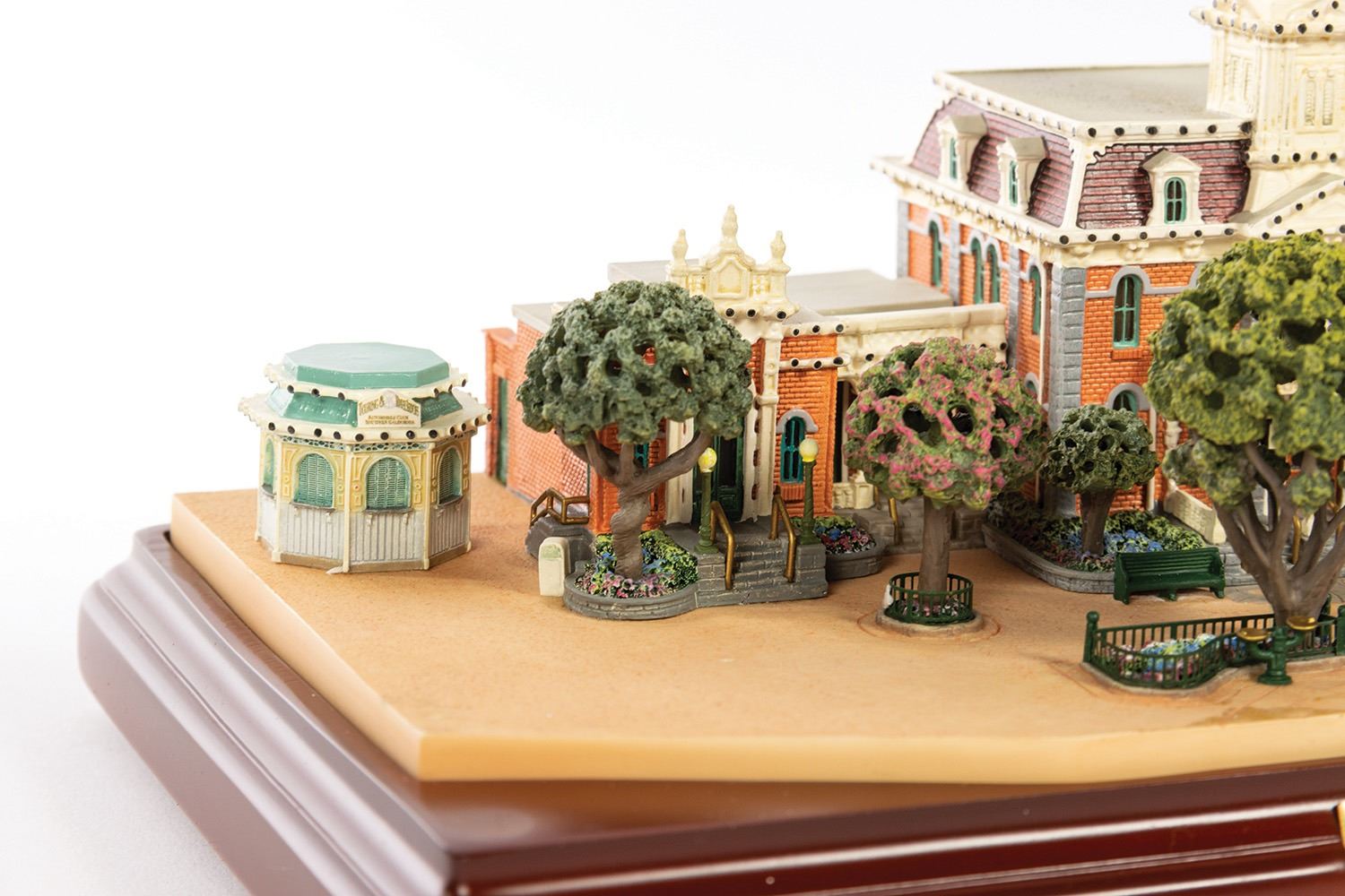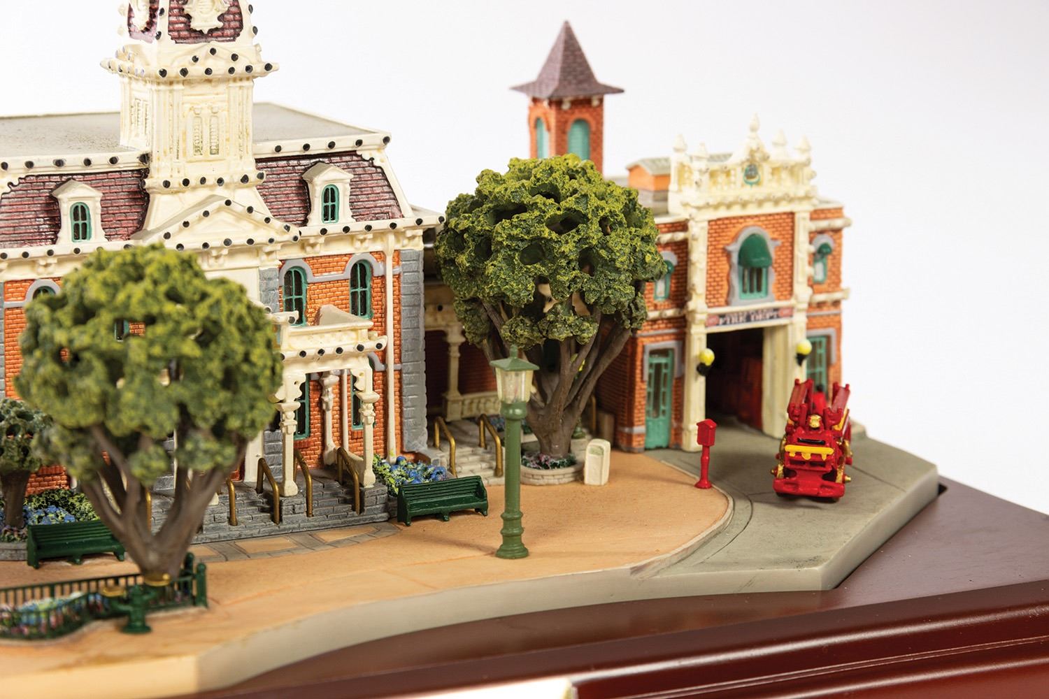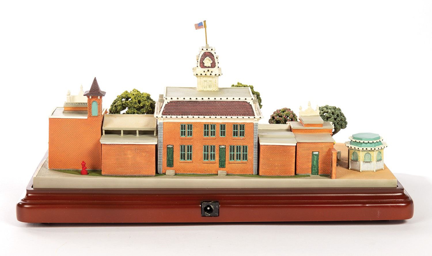 (Disneyland, 2004) A beautiful scale model of Disneyland's City Hall and Fire Station on Main Street. The model was created by renowned miniaturist Robert Olszewski for his very popular Main Street U.S.A. collection of models. The model has lighted elements that are powered by a battery compartment in the base, and comes with its original box, power cord, as well as loose fire hydrant, roof and fire truck figures. Measuring 5.5"x10" and approximately 3" tall, the model is very good condition. The roofs have crazing throughout, as is very common with these delicate models. A flag is missing and the box has wear throughout.