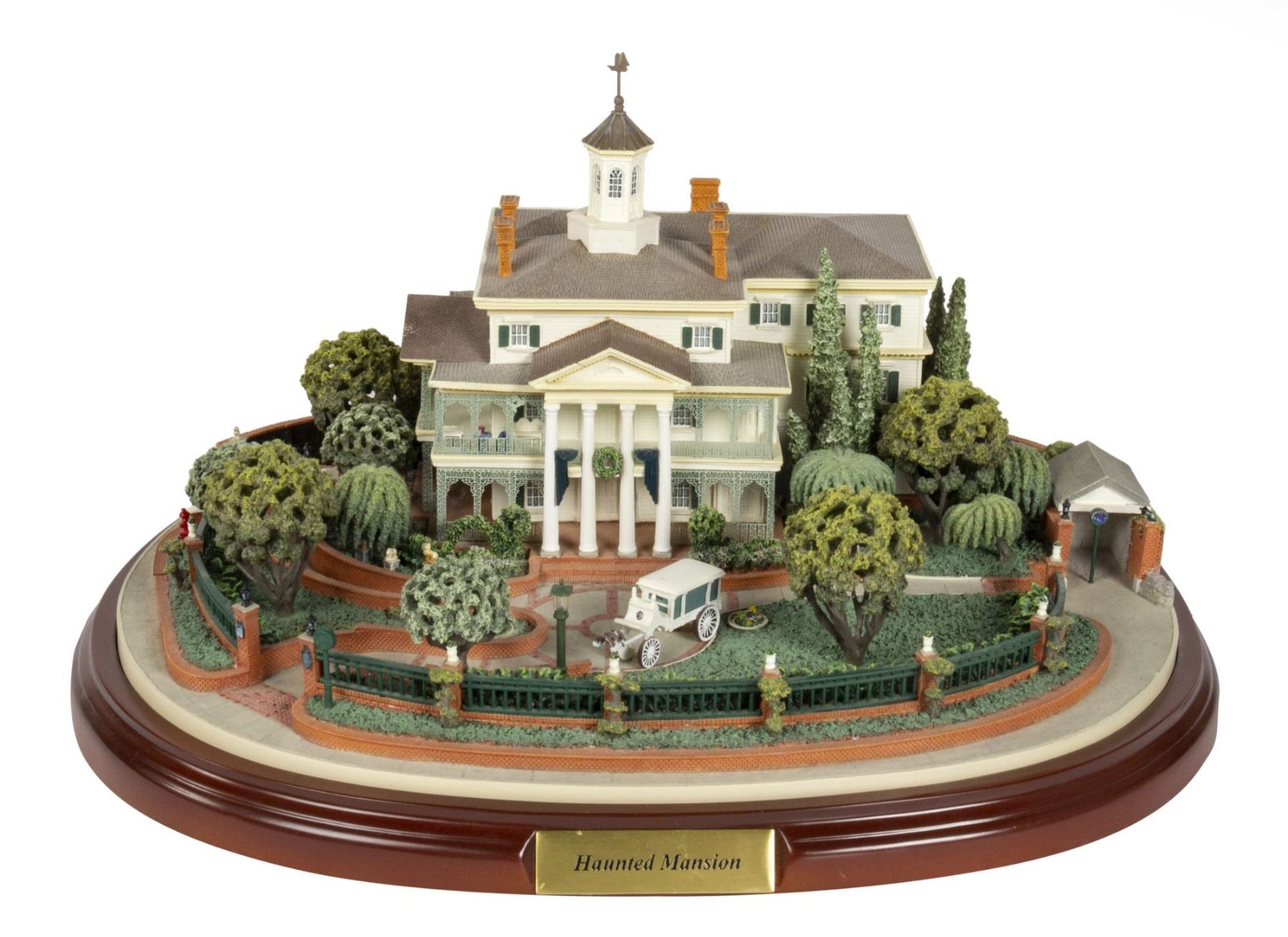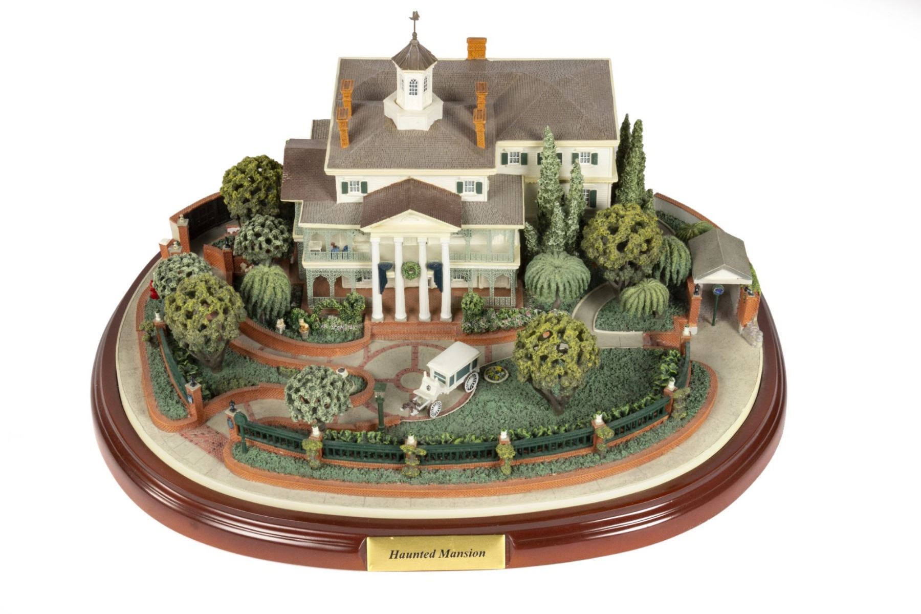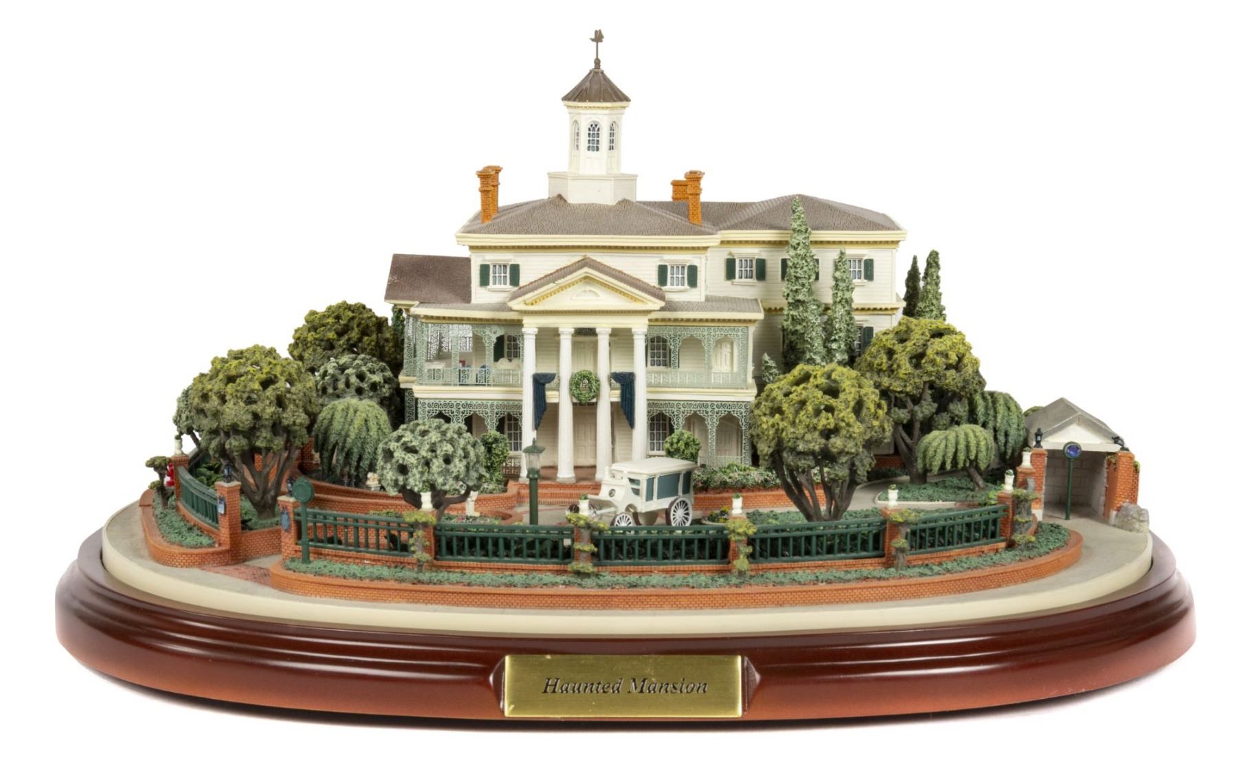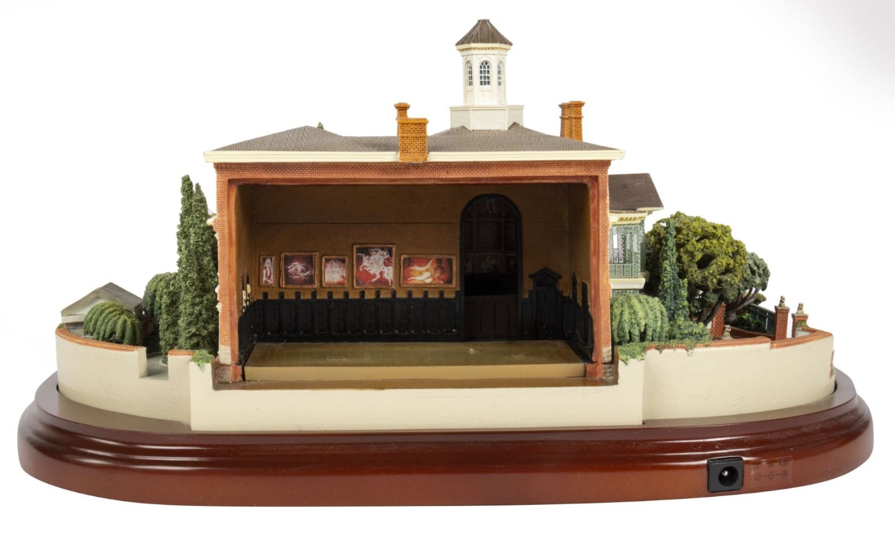 (Disneyland, 2005) An incredible 1/220th scale model of Disneyland's Haunted Mansion attraction building created by Robert Olszewski. This very rare replica includes three scenes from the attraction which can be inserted into the back of the model and light up. The interchangeable scenes include the changing portraits, banquet hall, and hitchhiking ghost scenes. Measuring 9.5"x12" and 6" tall, the model is in very good condition with minor wear, including one bent lantern by the attraction exit point. The model comes in its original 50th Commemorative Collection box and packaging with a Certificate of Authenticity. Also included is a light-stand for the scenes to be viewed separately if desired.