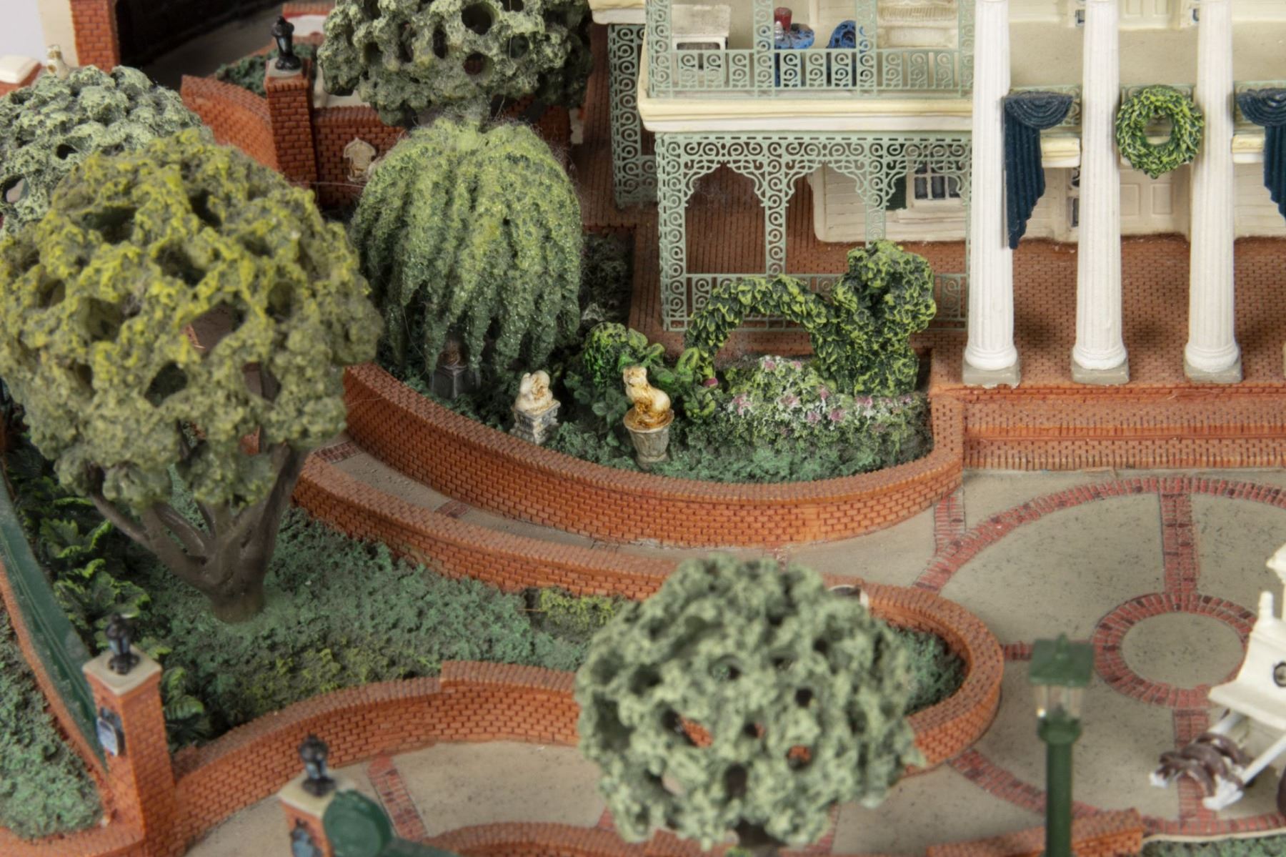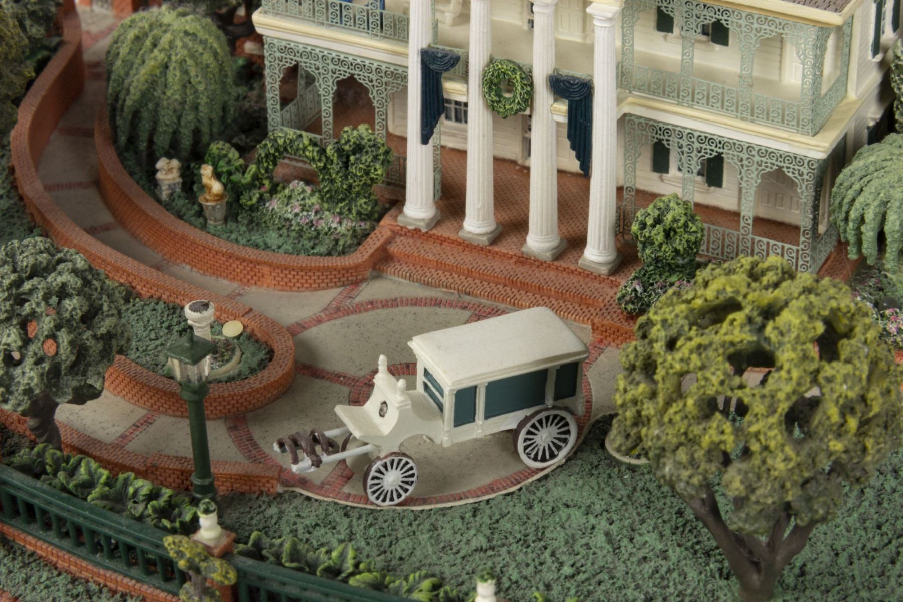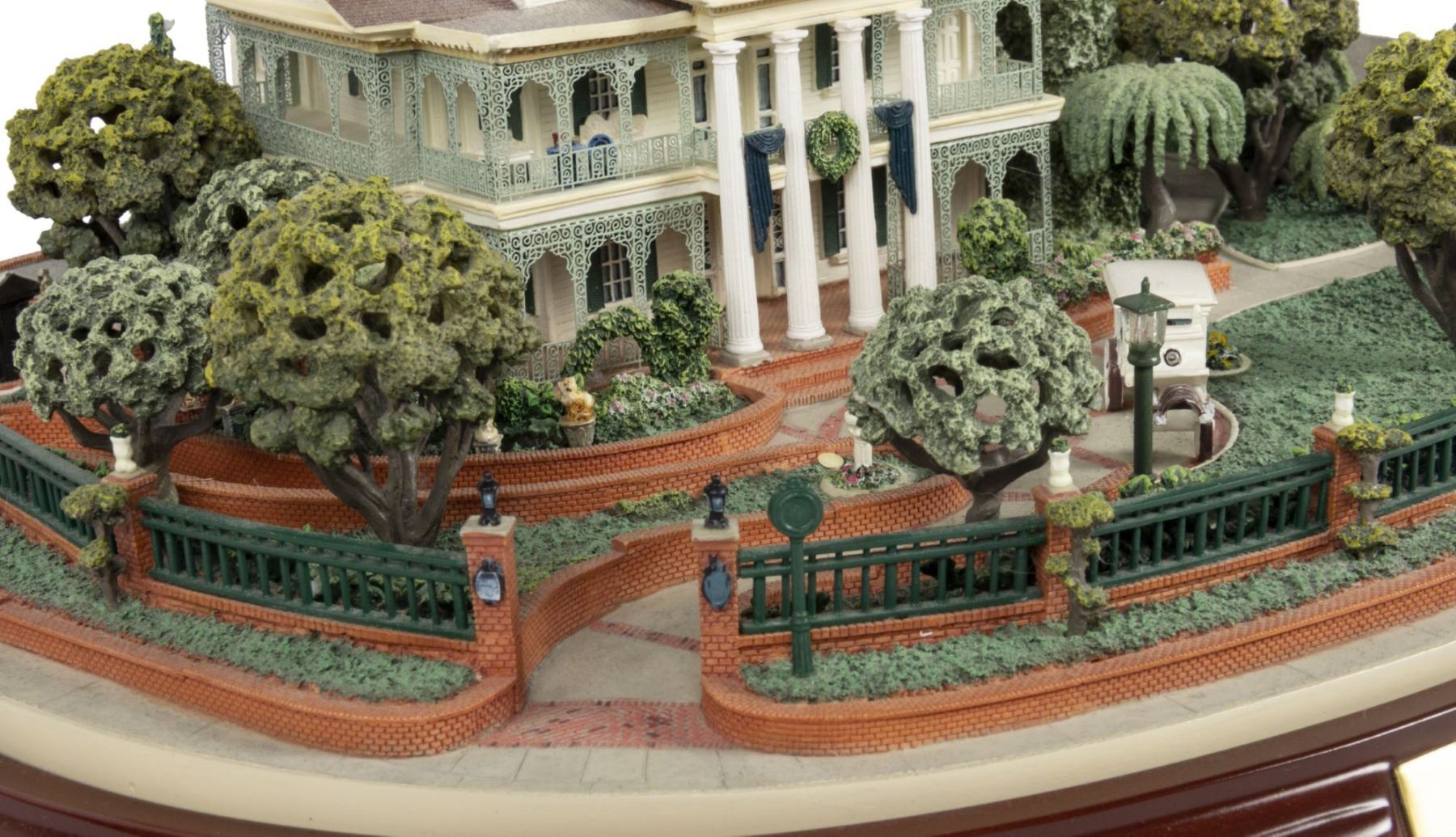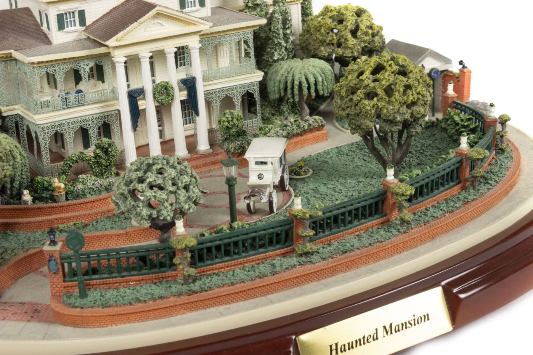 (Disneyland, 2005) An incredible 1/220th scale model of Disneyland's Haunted Mansion attraction building created by Robert Olszewski. This very rare replica includes three scenes from the attraction which can be inserted into the back of the model and light up. The interchangeable scenes include the changing portraits, banquet hall, and hitchhiking ghost scenes. Measuring 9.5"x12" and 6" tall, the model is in very good condition with minor wear, including one bent lantern by the attraction exit point. The model comes in its original 50th Commemorative Collection box and packaging with a Certificate of Authenticity. Also included is a light-stand for the scenes to be viewed separately if desired.