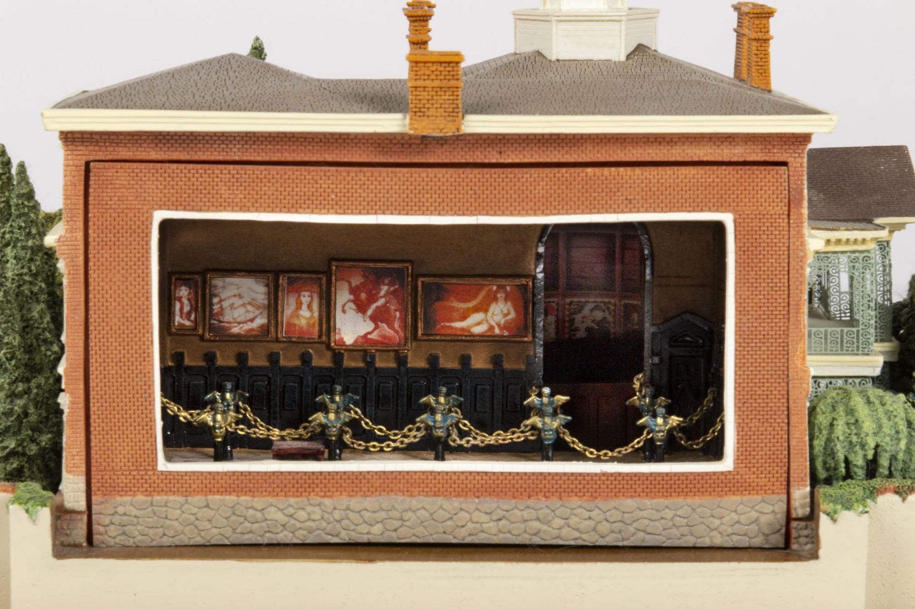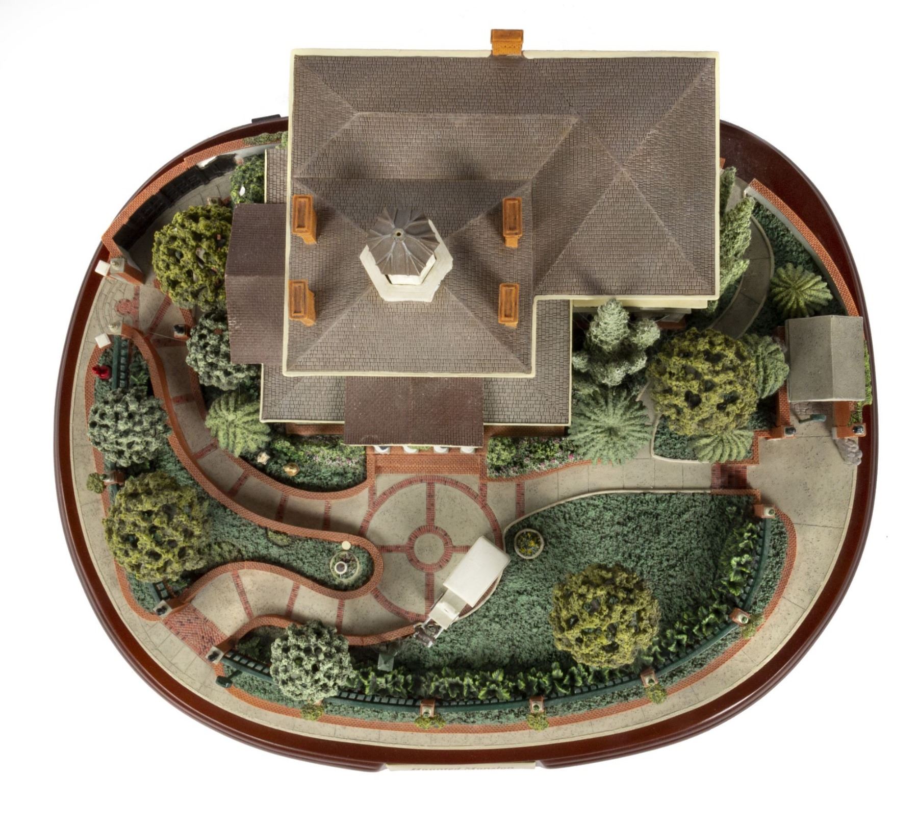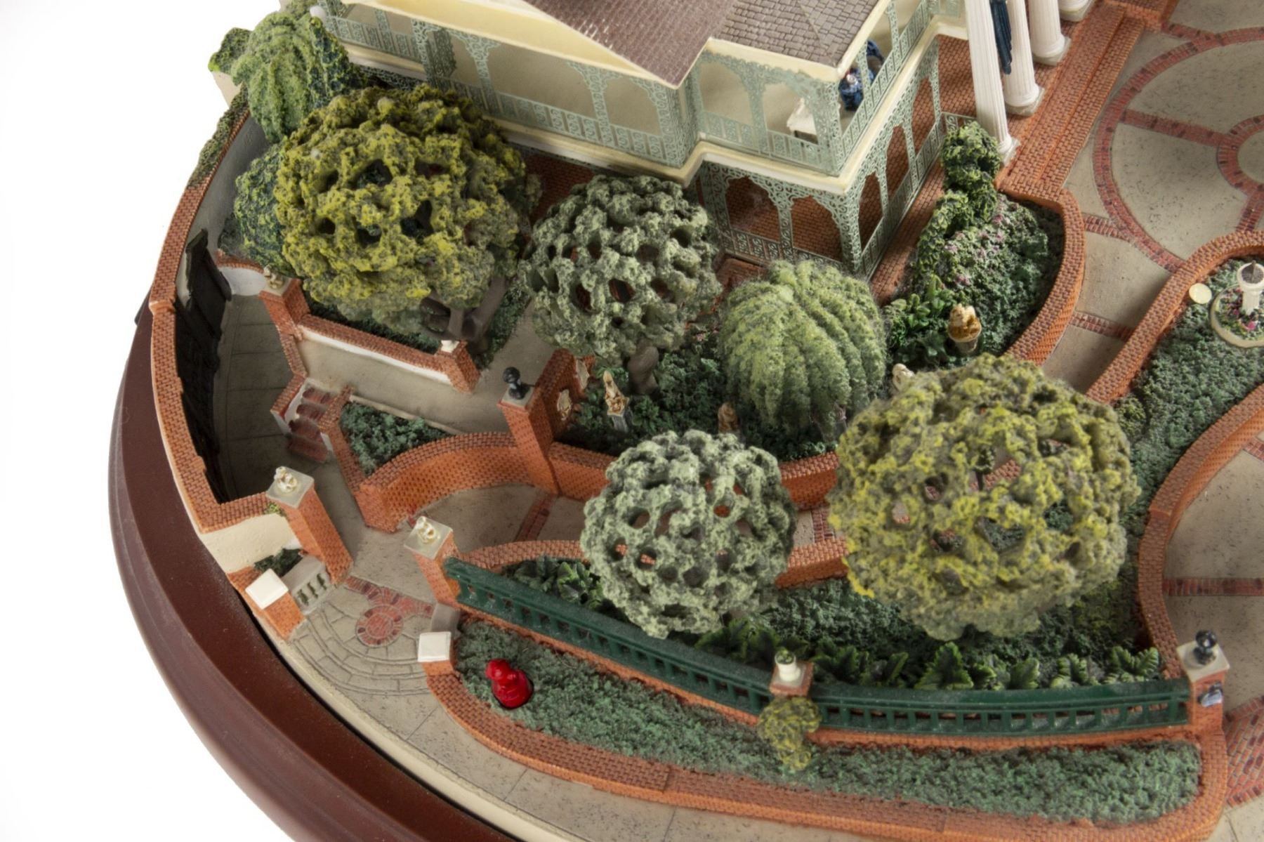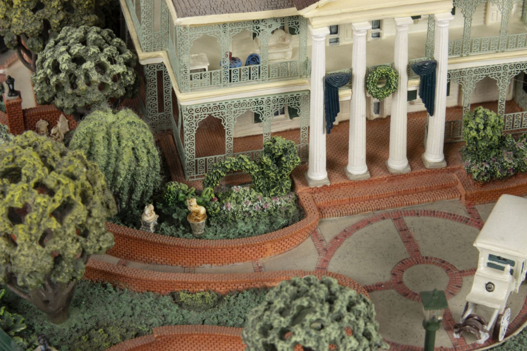 (Disneyland, 2005) An incredible 1/220th scale model of Disneyland's Haunted Mansion attraction building created by Robert Olszewski. This very rare replica includes three scenes from the attraction which can be inserted into the back of the model and light up. The interchangeable scenes include the changing portraits, banquet hall, and hitchhiking ghost scenes. Measuring 9.5"x12" and 6" tall, the model is in very good condition with minor wear, including one bent lantern by the attraction exit point. The model comes in its original 50th Commemorative Collection box and packaging with a Certificate of Authenticity. Also included is a light-stand for the scenes to be viewed separately if desired.