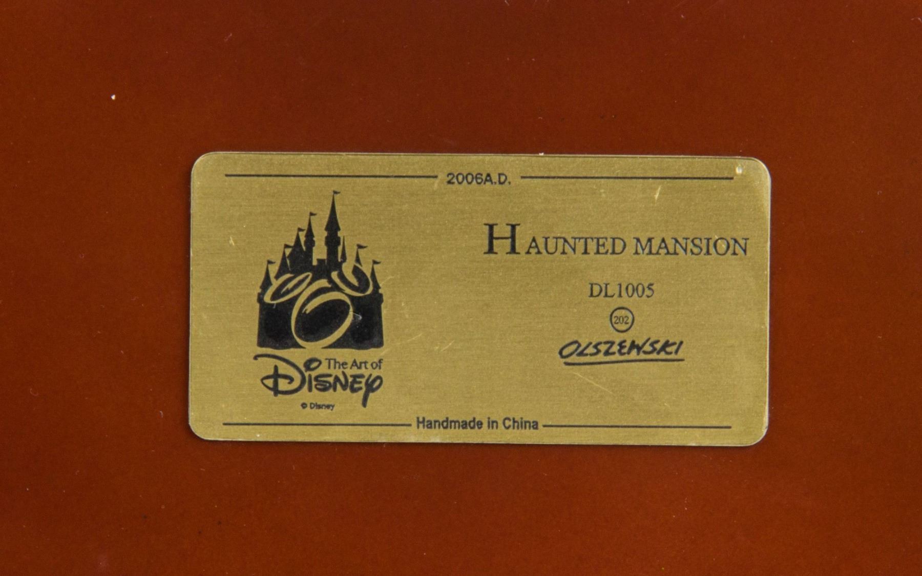 (Disneyland, 2006) An incredible model of the "Haunted Mansion" created by famed miniaturist, Robert Olszewski. This intricate model opens in the back to reveal three interchangeable scenes based on the attraction including the Gallery, Ballroom, and Graveyard with the three iconic Hitchhiking Ghosts. The model has LED lighting and some movable parts, and the scenes in the back light up when placed in the model. This incredible model measures approximately 12.5" wide, 5" deep, and 10.5" tall. The condition is very good with little wear and the model comes in its original box.
