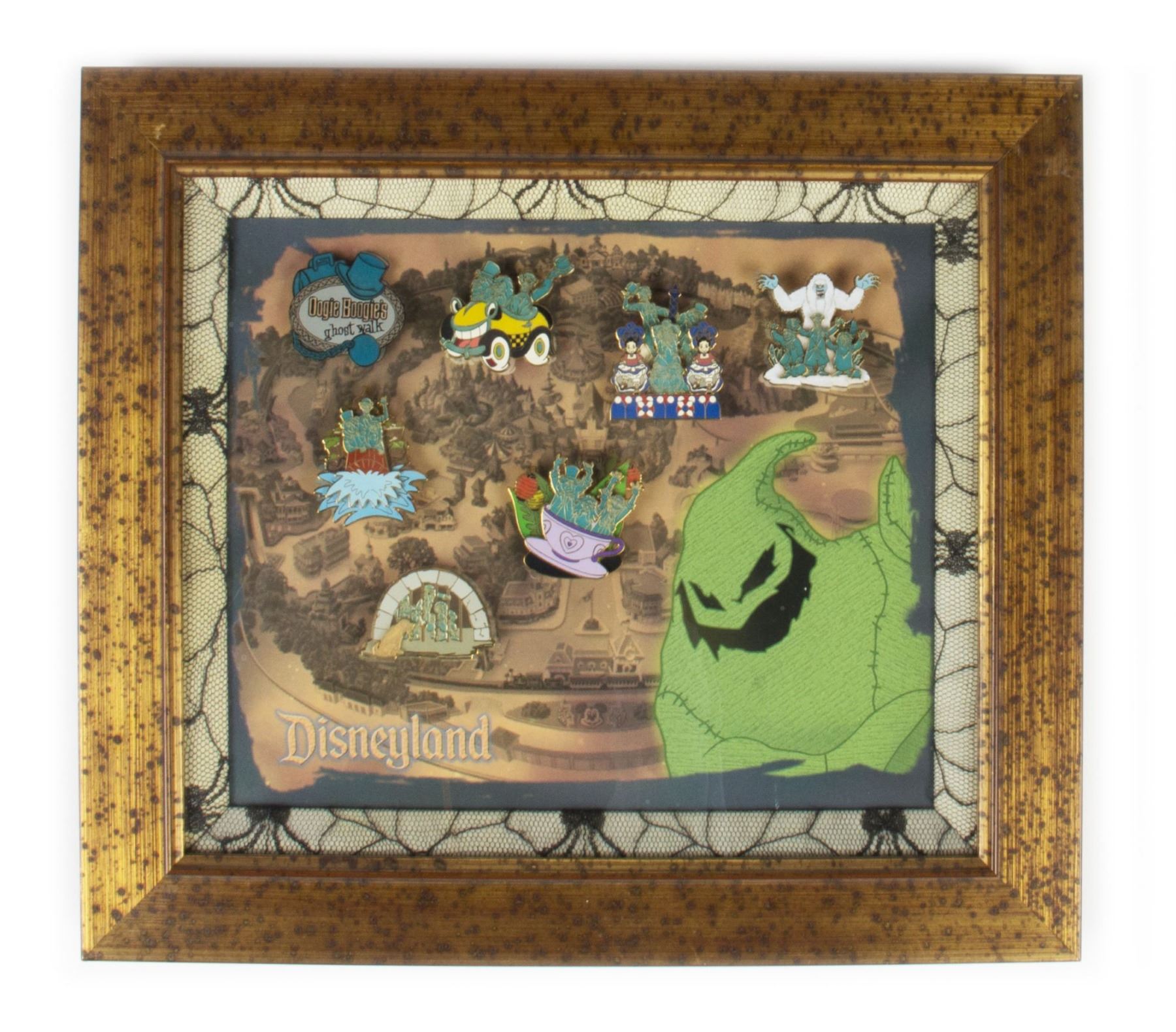 (Disneyland, 2002) A framed set of (7) limited edition pins from Disneyland's "Oogie Boogie's Ghost Walk" event in 2002. The event had park guests finding clues around the park as to the whereabouts of the Hitchhiking Ghosts from the "Haunted Mansion". The set includes all (6) pins featuring the Hitchhiking Ghosts within different attractions as well as a special pin with the name of the event. The pins were limited to 1500 pieces, and come beautifully custom framed. The frame measures 12"x14" and the condition is very good.