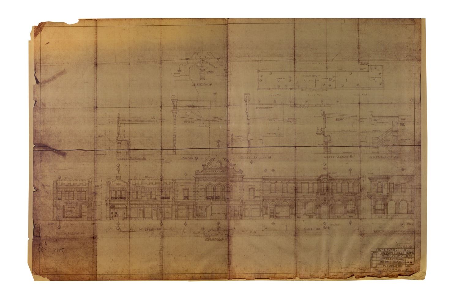 (Disneyland, c.1970s-80s) A construction brownline featuring details for the "Opera House" and its adjacent buildings on Main Street at Disneyland. The brownline is titled "Elevations" and features the original imagery dated 4-8-55, although this brownline was most likely used during later construction or maintenance between the 1970s and 1980s. This item measures 42"x64" and is in good condition with some edge-wear from use including some wrinkling and tearing around the border.