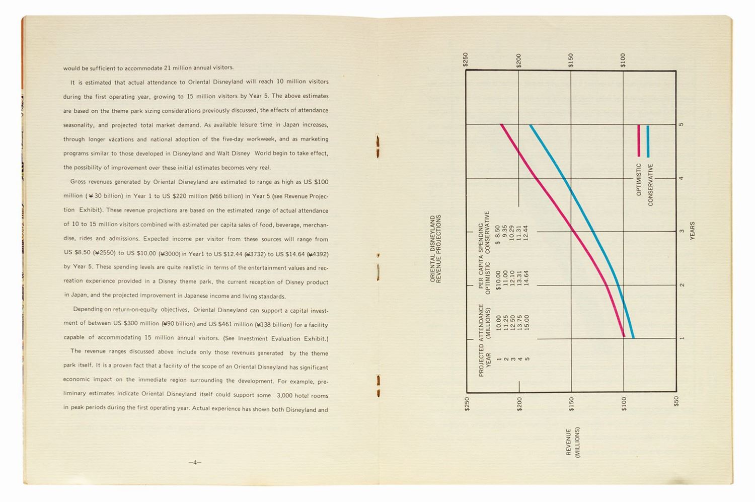 (Tokyo Disneyland, 1975) A feasibility study executive summary for "Oriental Disneyland," the early name of Tokyo Disneyland. This study includes a summary and recommendations, as well as graphs showing revenue projections and economic feasibility for the potential park. Measuring 11"x8.5", the study is in fair condition, with some edge-wear and surface wear throughout the cover.
