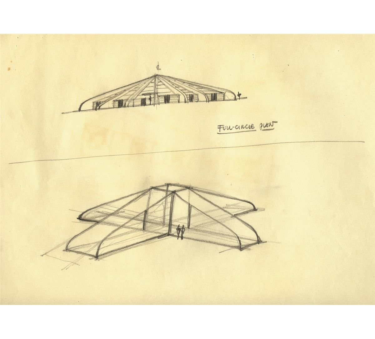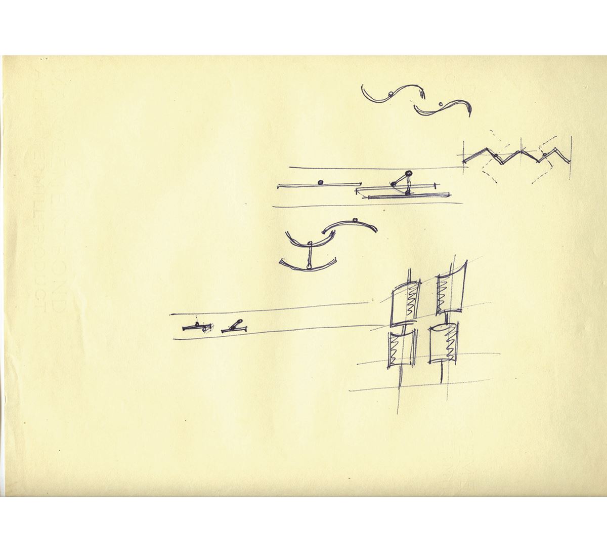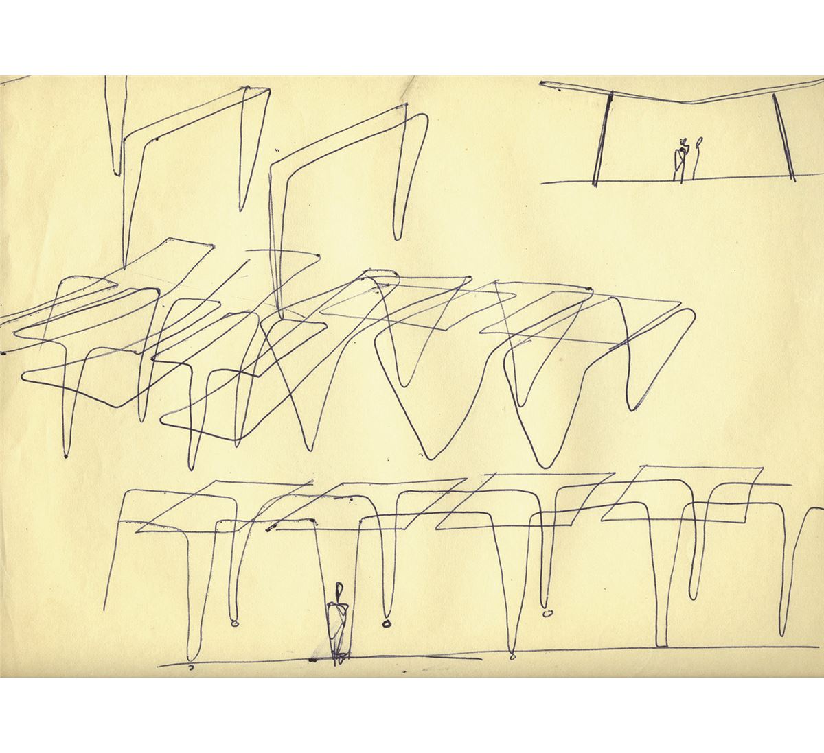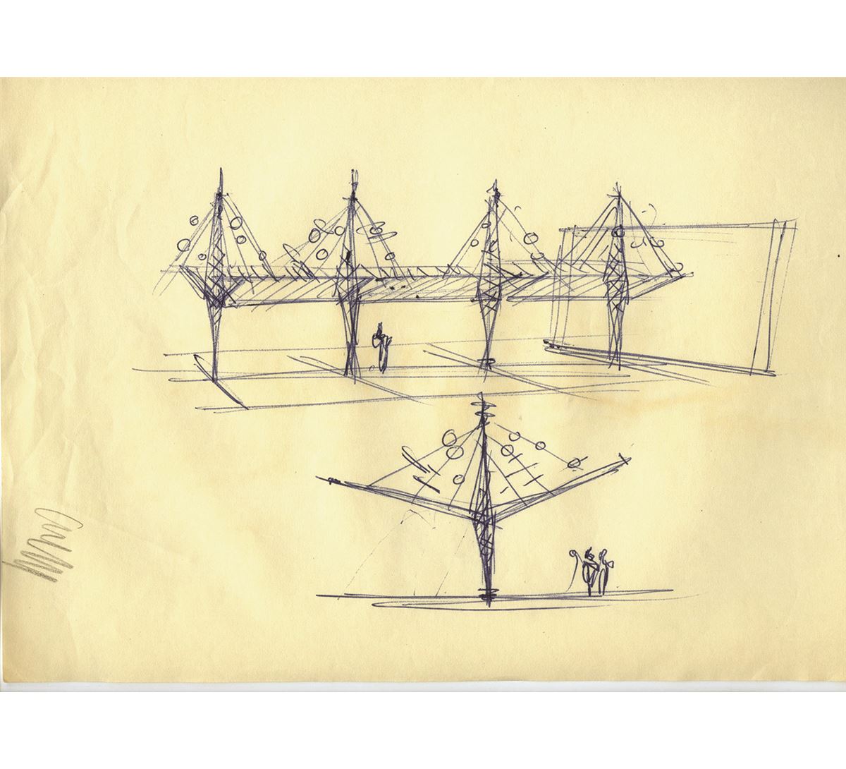 (Disneyland, 1955) Incredible set of (8) original concept drawings by Gabriel Scognamillo, the art director for Tomorrowland. The drawings are rough designs for the futuristic facades for exhibition space and rest areas that were placed throughout the land. Accomplished in graphite and ink on untrimmed 10”x12” animation paper. All are in good condition with some creasing and light staining and pinholes in corners.
