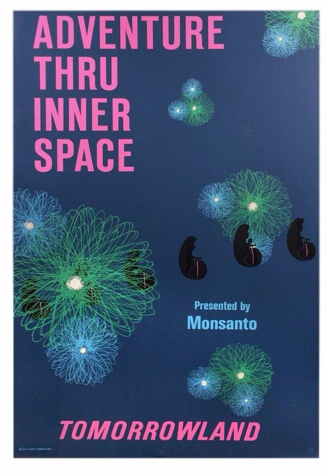 (Disneyland, 1967) An original hand-silkscreened poster for the "Adventure Thru Inner Space" attraction. Designed by John Drury, this poster depicts guests shrinking smaller than an atom with beautiful use of color. This item measures 54"x36" and is in very good condition, mounted to a foam core backing, with some minor edge-wear and creasing.