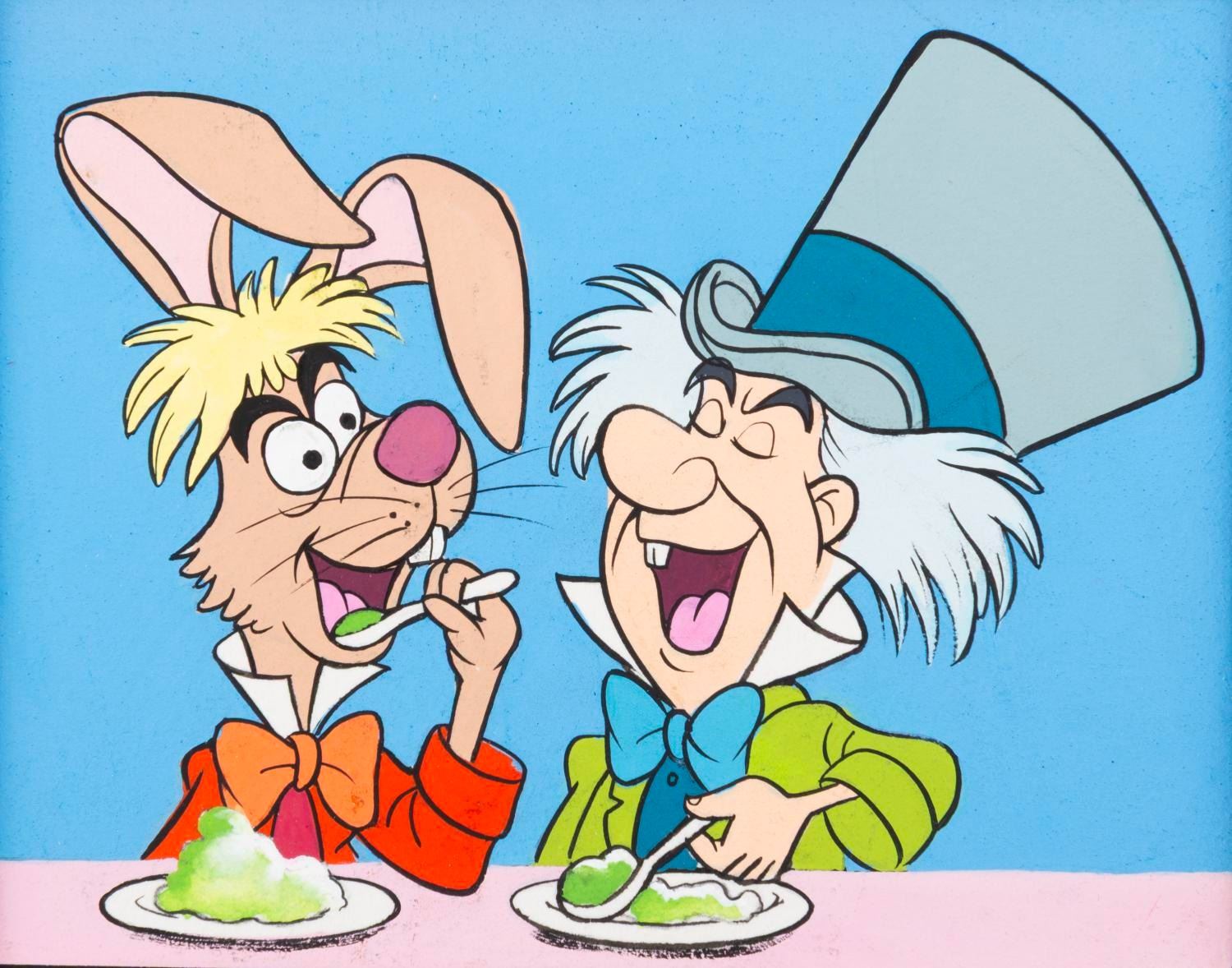 (Disney, 1970s-80s) An original painting of the Mad Hatter and March Hare from "Alice in Wonderland " created for use in a book or magazine. Measuring 3 " x 3.75 " and 9 " x 9.75 " matted, the painting is in very good condition with light wear from production, including very light soiling.