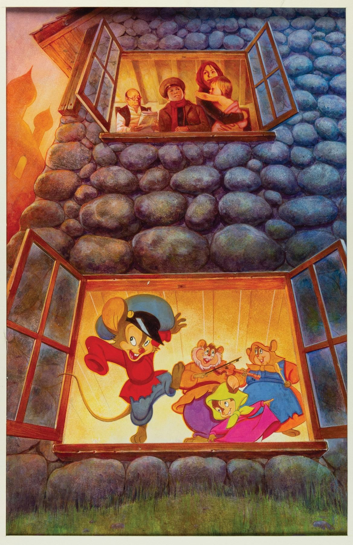 (Amblin, 1986) An original concept painting for a poster for An American Tail. Attributed to poster artist Tom Jung, the painting is accomplished in acrylic and colored pencil, with several layers of trimmed and applied artwork used to create the full image. The painting is matted with an image size of 23"x14.5" within the 30"x20" mat. The condition is good overall, with a few scuffs to the imagery and some tape residue along the top-edge.