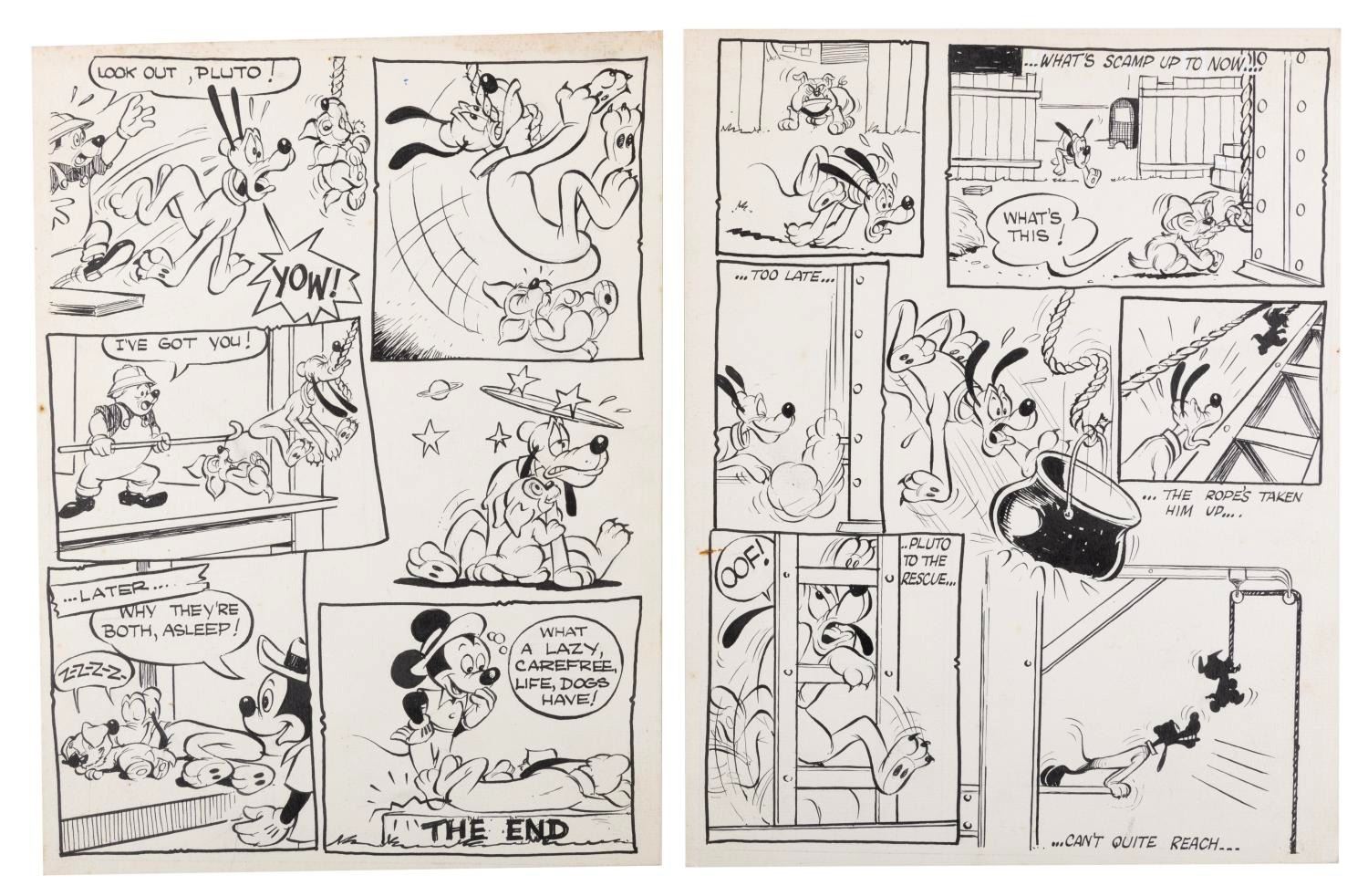 (Disney, 1970s) The original art for two pages of a comic book story featuring Pluto and Scamp along with Mickey Mouse. Each measuring 8" x 10.5", the ink on artboard pages are in very good condition with light edge wear, and a small stain to one.