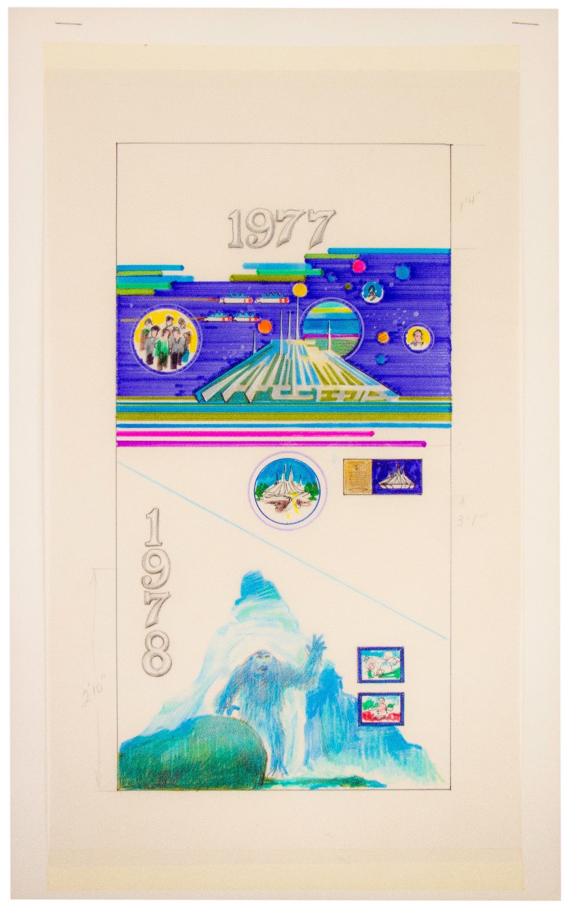 (Disneyland, 1977-78) A beautiful original illustration featuring "Space Mountain" and the "Matterhorn Bobsleds". The artwork is accomplished in marker and colored pencil on vellum, and was created to promote the opening of "Space Mountain" in 1977 as well as the "Matterhorn Bobsleds" refurbishment of 1978. This Bobsled refurbishment added the now-iconic Yeti character to the attraction. The illustration is adhered within a production folder, and the entire item measures 17.25"x11". This illustration is in very good condition with slight edge-wear to the folder.