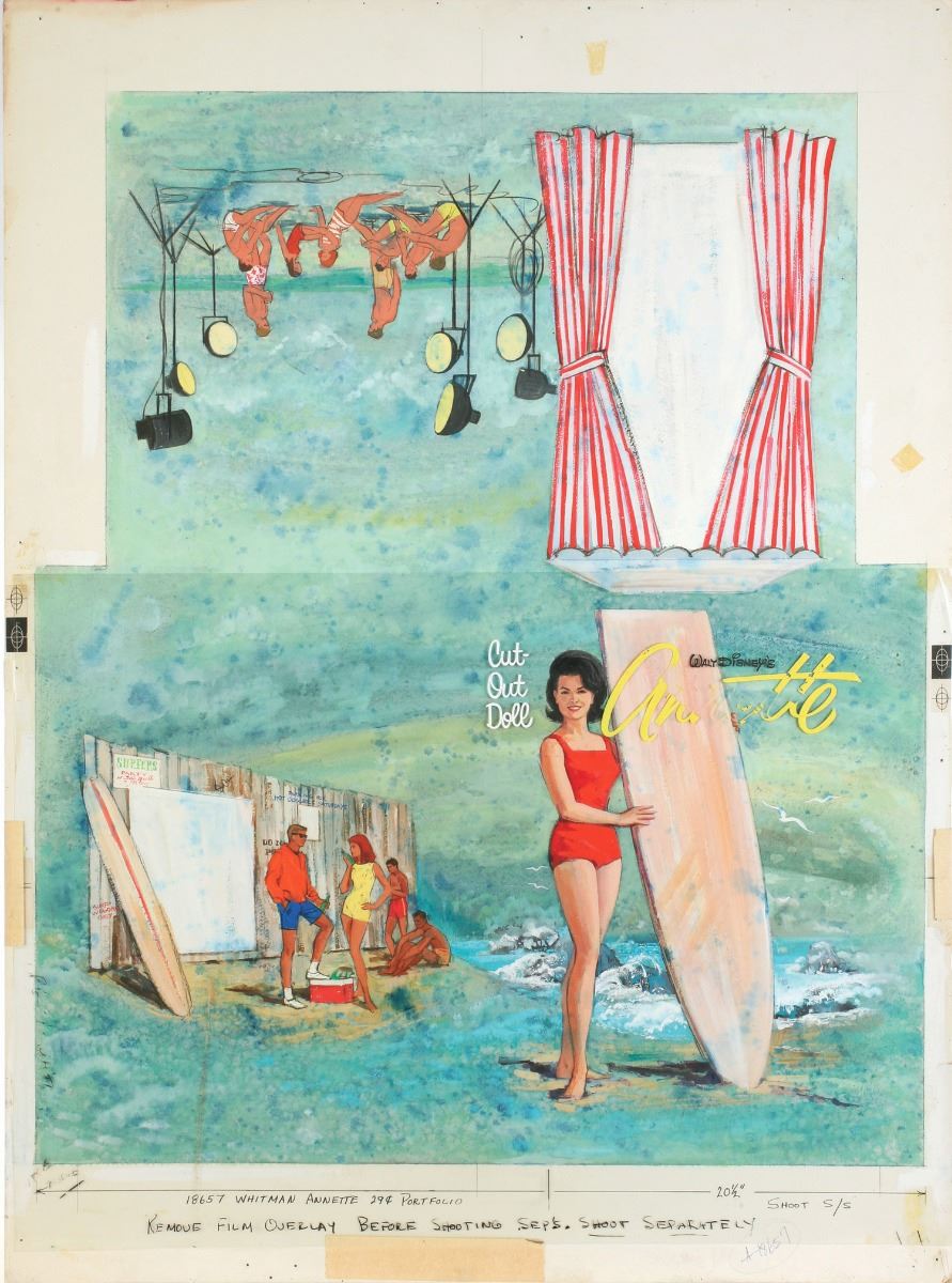 (Walt Disney Studios, 1964) Rare original artwork for the cover of the Annette Cut-Out Dolls Book. Accomplished in gouache with lettering cel overlays, on 22"x30" artists' board. In very good condition with some paint loss to cel overlays.