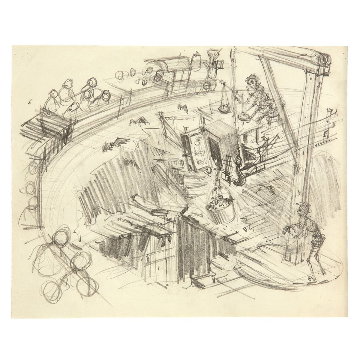 (Walt Disney World, 1979) Extremely rare original concept drawing by Imagineer Clem Hall for a Runaway Train attraction at Disney World that eventually became the Big Thunder Railroad attraction. Accomplished in graphite on 10.25”x8.5” sketch paper. In very good condition with minor wear.