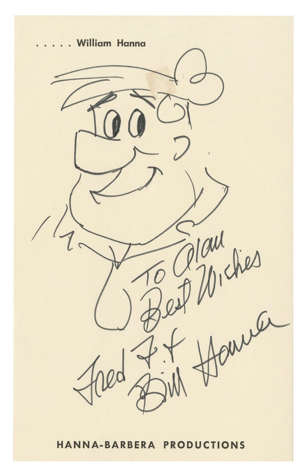 (Hanna-Barbera, c.1980) An original drawing of Fred Flintstone by Hanna-Barbera's own Bill Hanna. Created in ink on Hanna's own studio stationary, the drawing is personalized to a fan, Alan, and measures 8"x5". The condition is very good with minor surface wear.