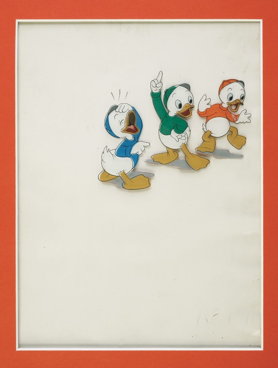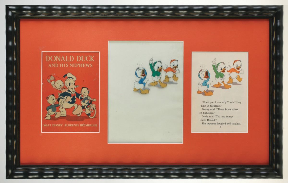 (Walt Disney Studios, 1940) Hand-painted cel used as artwork for page six of D.C. Heath's "Donald Duck and His Nephews". The untrimmed cel measures 10" x 12". Artwork is beautifully framed with the page from the book.