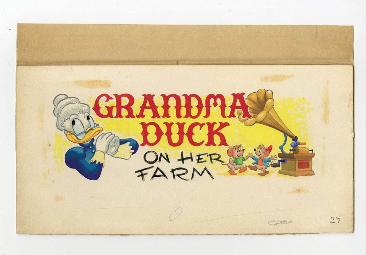 (Walt Disney Studios, c.1950s) Beautiful original title artwork, possibly for a comic book or Golden Book titled Grandma Duck on her Farm. Accomplished in Gouache on 5.5"x11.5" artists' board and featuring Grandma dusk and Gus and Jaq. In very good condition.