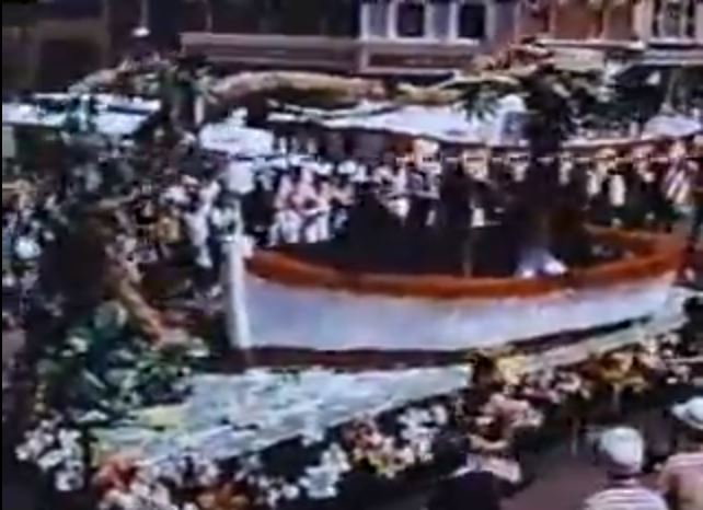 (Disneyland, 1959) Many Disney historians consider 1959 to be the “second grand-opening” of Disneyland. Ever progressive, and always striving to improve the park as well as stay ahead of competitors, Walt drove his team to complete the biggest expansion in the park’s history. Calling it “a brand new Disneyland”, five new attractions were opened in 1959 including The Matterhorn, The Monorail, and the Submarine Voyage. In just four short years, Disneyland had gone from 22 attractions on opening day to 48 in 1959. This float design represented Adventureland in the Disneyland 1959 re-opening parade. Accomplished in pencil and charcoal on 19 x 24 in. vellum by Disneyland art director, Bruce Bushman. Very good condition overall.