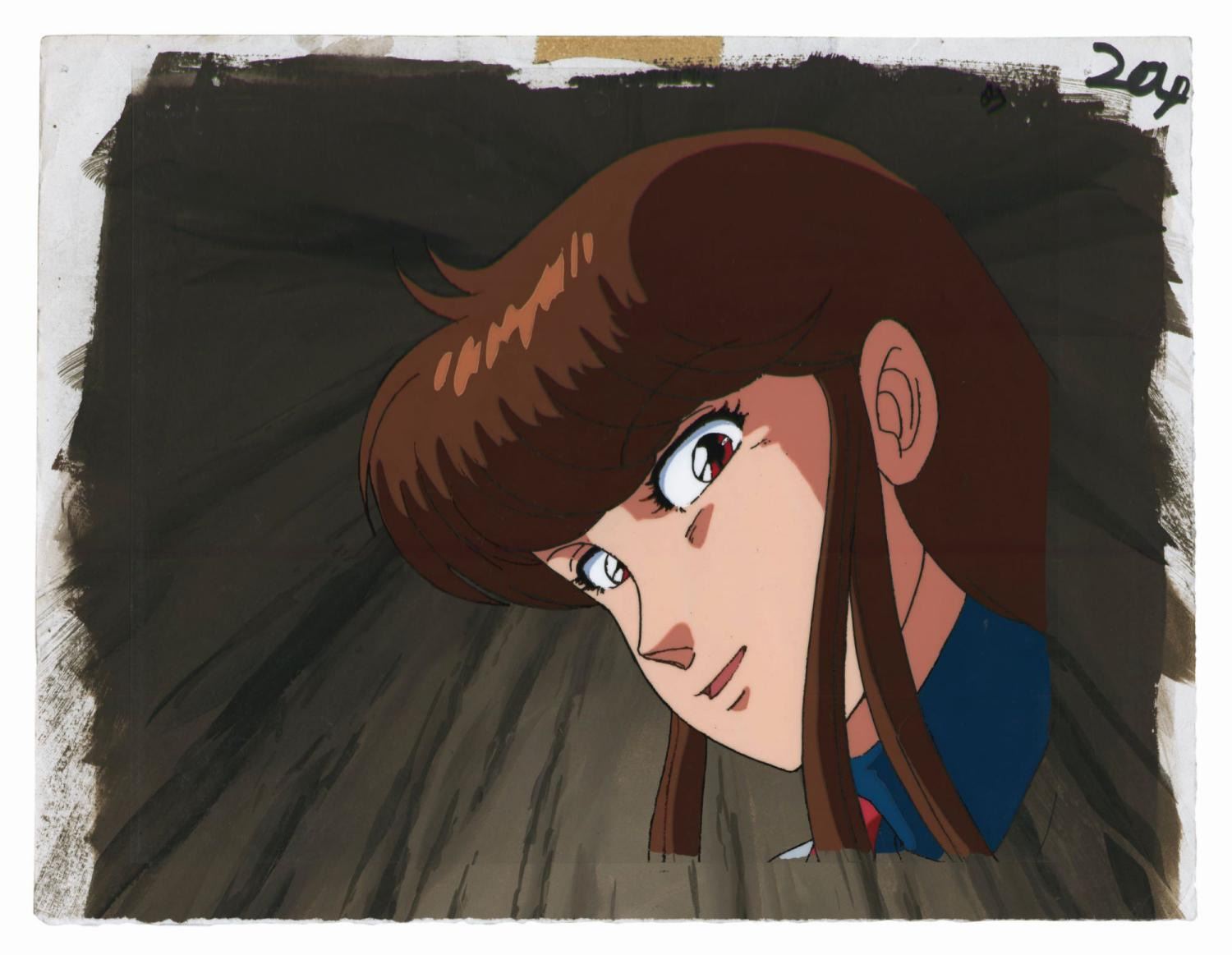 (AIC, 1991) An original production cel and background from the anime Bubblegum Crash. The cel features Priss, one of the Knight Sabre team, and is placed over a hand-painted production background from the series. The image measures 8.25"x7.75" on the 9"x10.5" cel, which is placed over the 10"x13" background. The condition is very good with some minor edge-wear to the background.