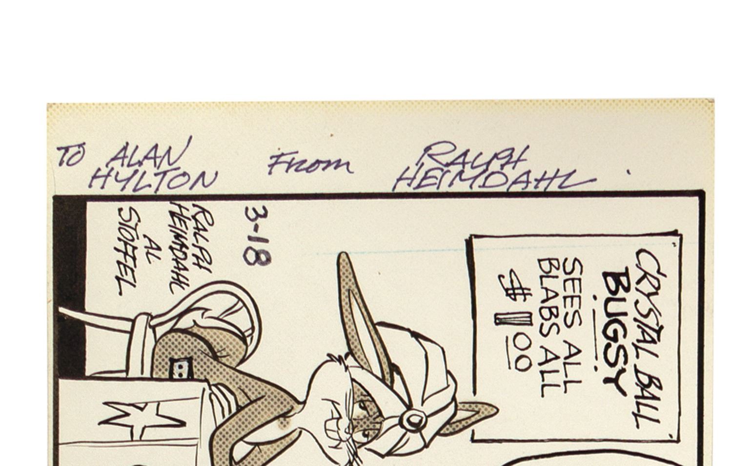 (Warner Bros., 1974) An original illustration for a Bugs Bunny comic strip that is signed by artist Ralph Heimdahl. The strip ran for 51 years, with Heimdahl and writer Al Stoffel working on it from 1947-1979. Measuring 6"x21.5", the illustration is accomplished in ink on cardstock and is in very good condition with minor edge wear, and a crease down the center from prior folding. Heimdahl personalized the signature "To Alan Hylton" and signed along the left edge. This signature was added after its initial use.
