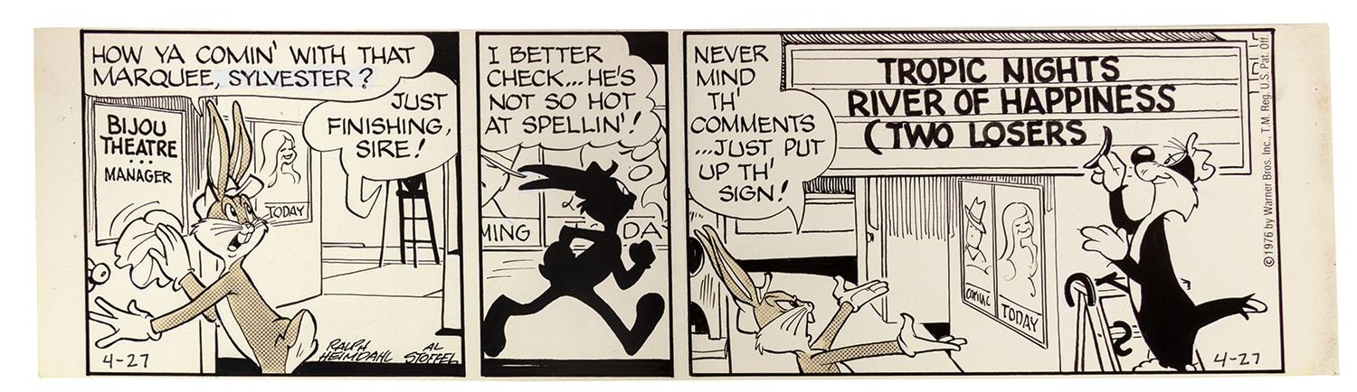 (Warner Bros., 1976) An original illustration by artist Ralph Heimdahl that was created for a Bugs Bunny comic strip. The strip ran for 51 years, with artist Ralph Heimdahl and writer Al Stoffel working on it from 1947-1979. Measuring 5"x17.5", the strip was created in ink on cardstock and is in very good condition with minor edge-wear, and a crease down the center from prior folding.