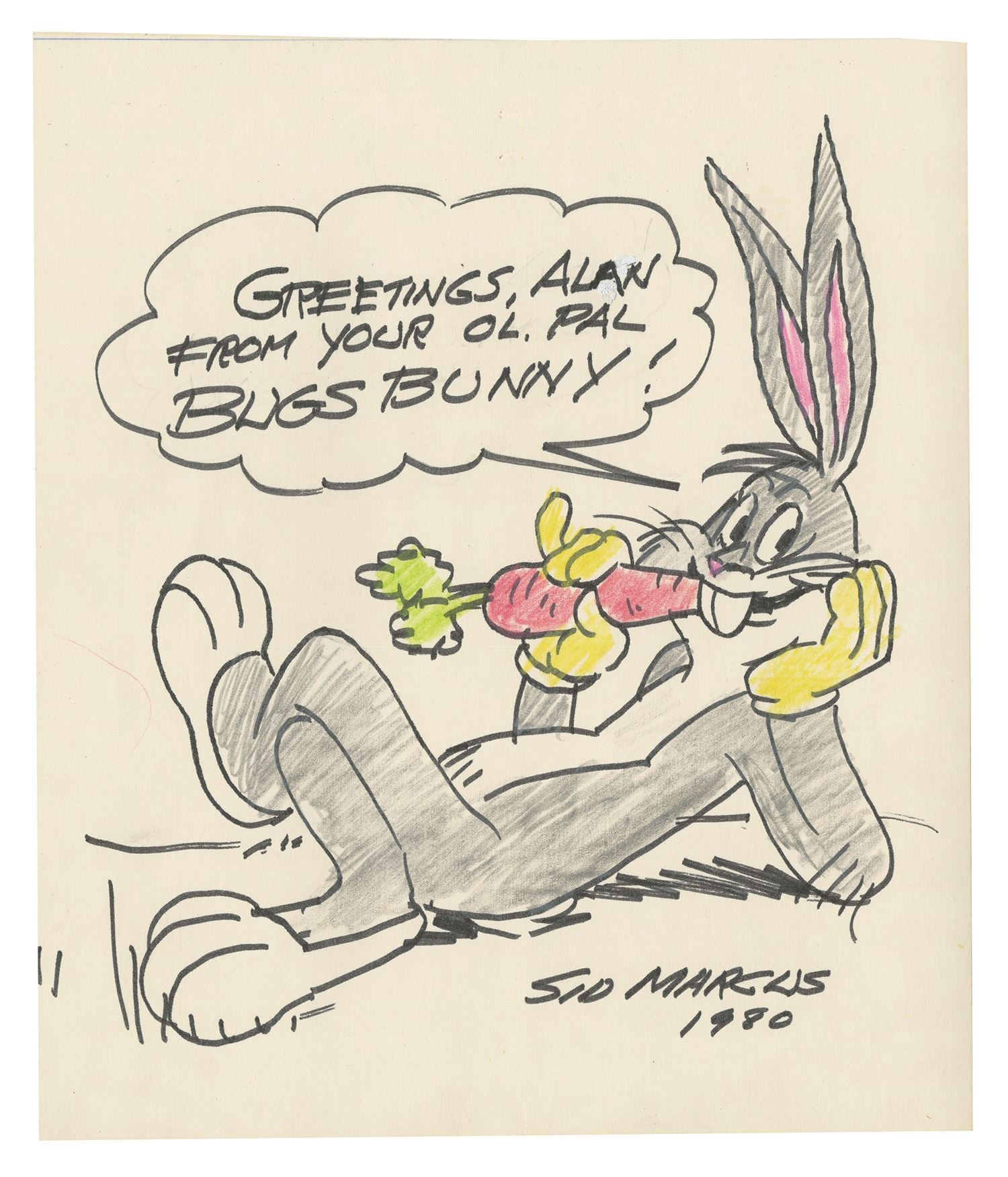 (Warner Bros., 1980) An original ink and colored pencil drawing of Bugs Bunny by animator and director, Sid Marcus. Beginning his career in animation in 1916, Marcus would work for Charles Mintz, Warner Bros, and Walter Lantz, among others. He worked as a story artist for Merrie Melodies and Looney Tunes in the 1950s, and this drawing of Bugs Bunny is personalized and signed by Marcus to a fan, Alan Hylton. Measuring 10"x8.25", the drawing is in very good condition with minor wear from use.