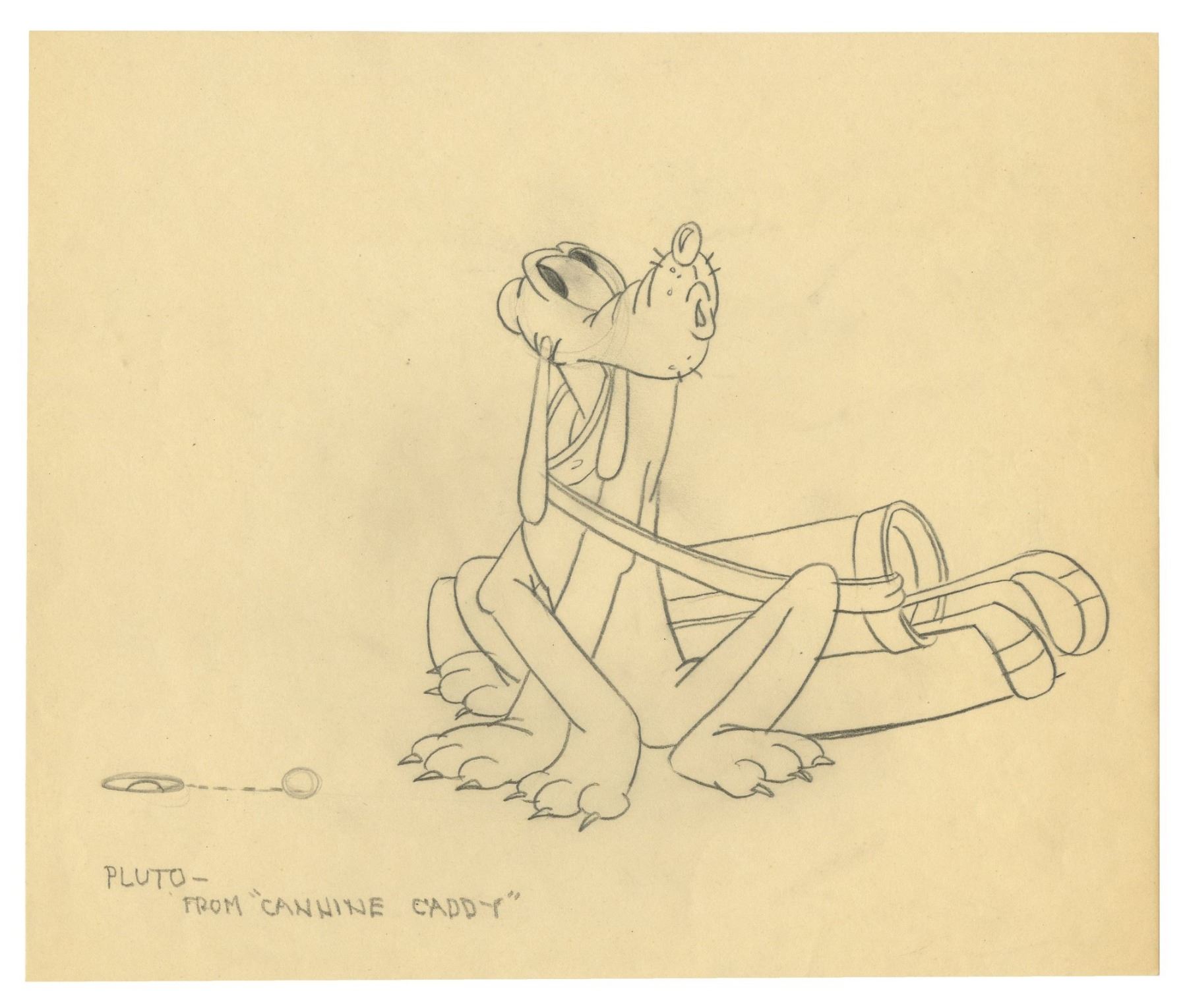 (Walt Disney Studios, 1941) An original drawing of Pluto used in the production of the short Canine Caddy. Created in pencil on trimmed animation paper, the drawing measures 8"x9.5" and is in very good condition. The title of the short is written in the bottom-left corner, and is believed to have been added later in the 1970s when this drawing was given as a gift. Some details including the golf ball and hole, and portions of Pluto's legs are believed to have been added later in order to make a more complete character image.