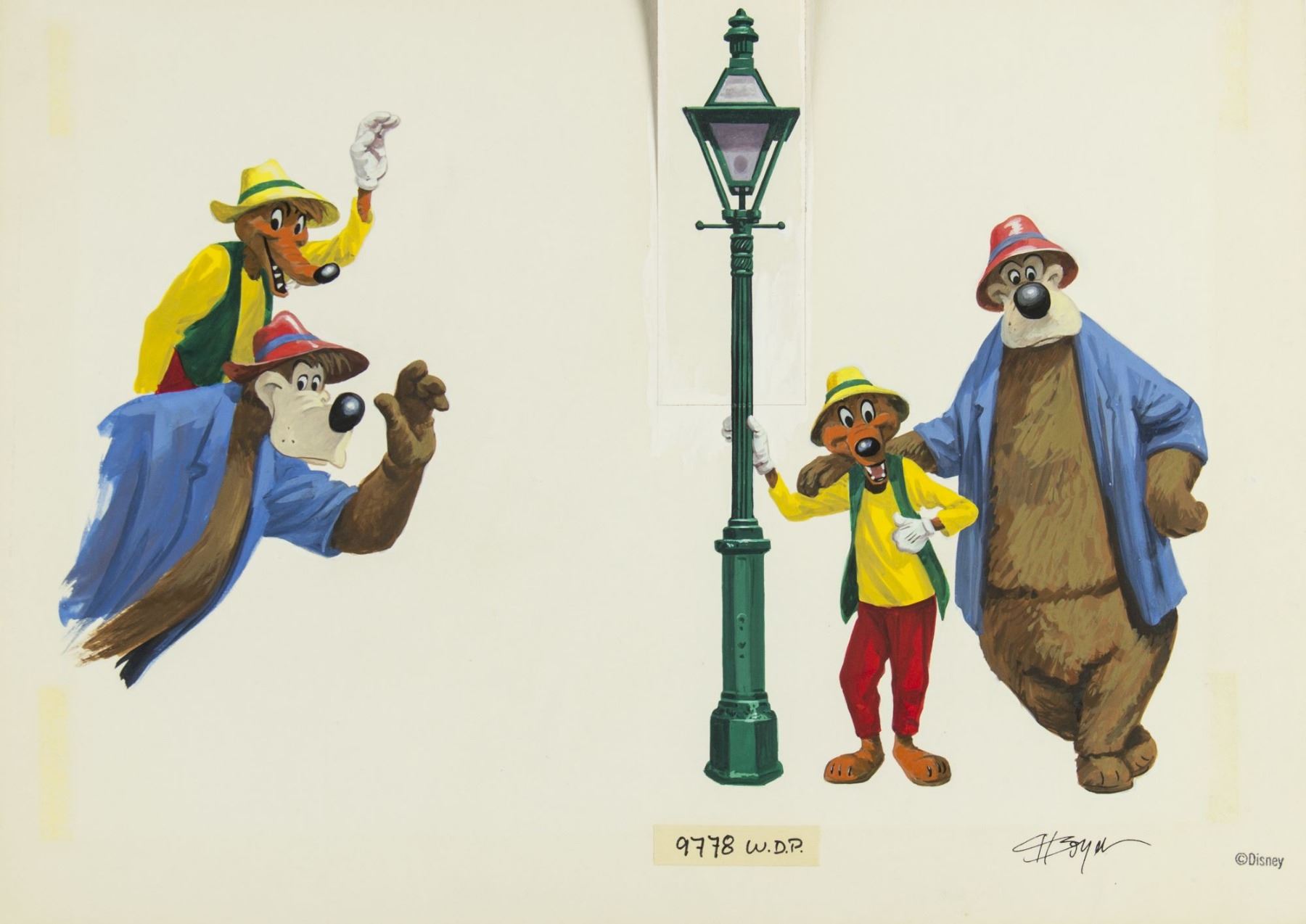 (Disneyland, c.1989) An original painting created by Charles Boyer that depicts the characters Br'er Bear and Br'er Fox. This artwork is accomplished in acrylic on artist's board, and was likely used in the promotion of Disneyland's newest attraction, "Splash Mountain". Boyer signed the artwork in the lower-right next to the production label "9778 W.D.P.". There is a protective clear cel layer taped over the front of the artwork for its protection. The painting measures 12.25"x17" and is in very good condition with minor edge-wear. The top-half of the lamppost was redesigned, where Boyer cut out and adhered a new layer onto the board. This small portion is lifting slightly along the top-edge.