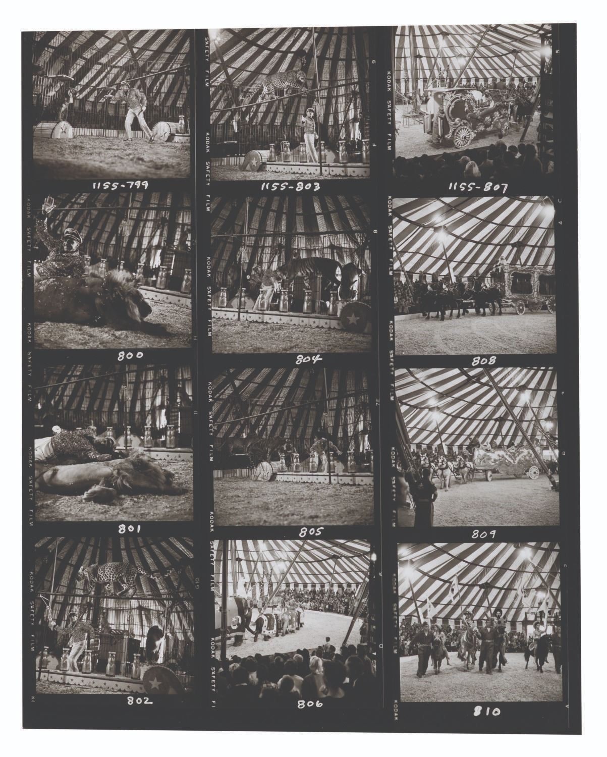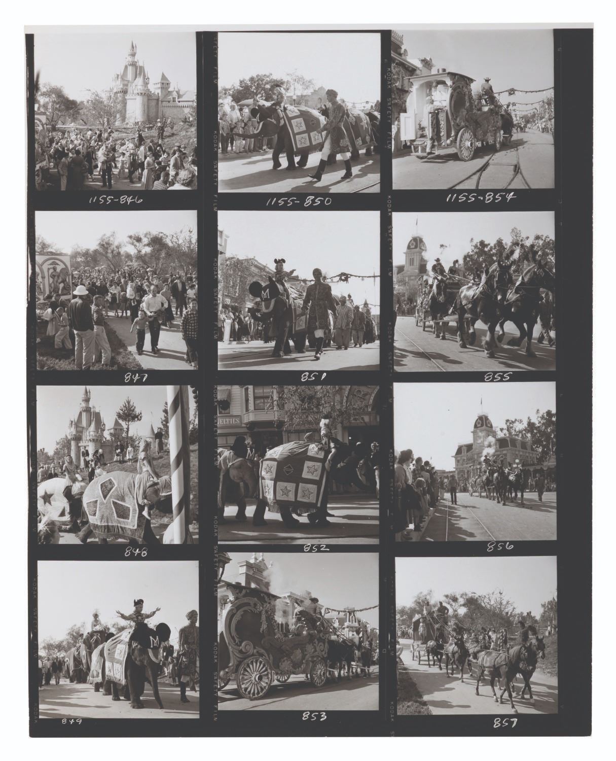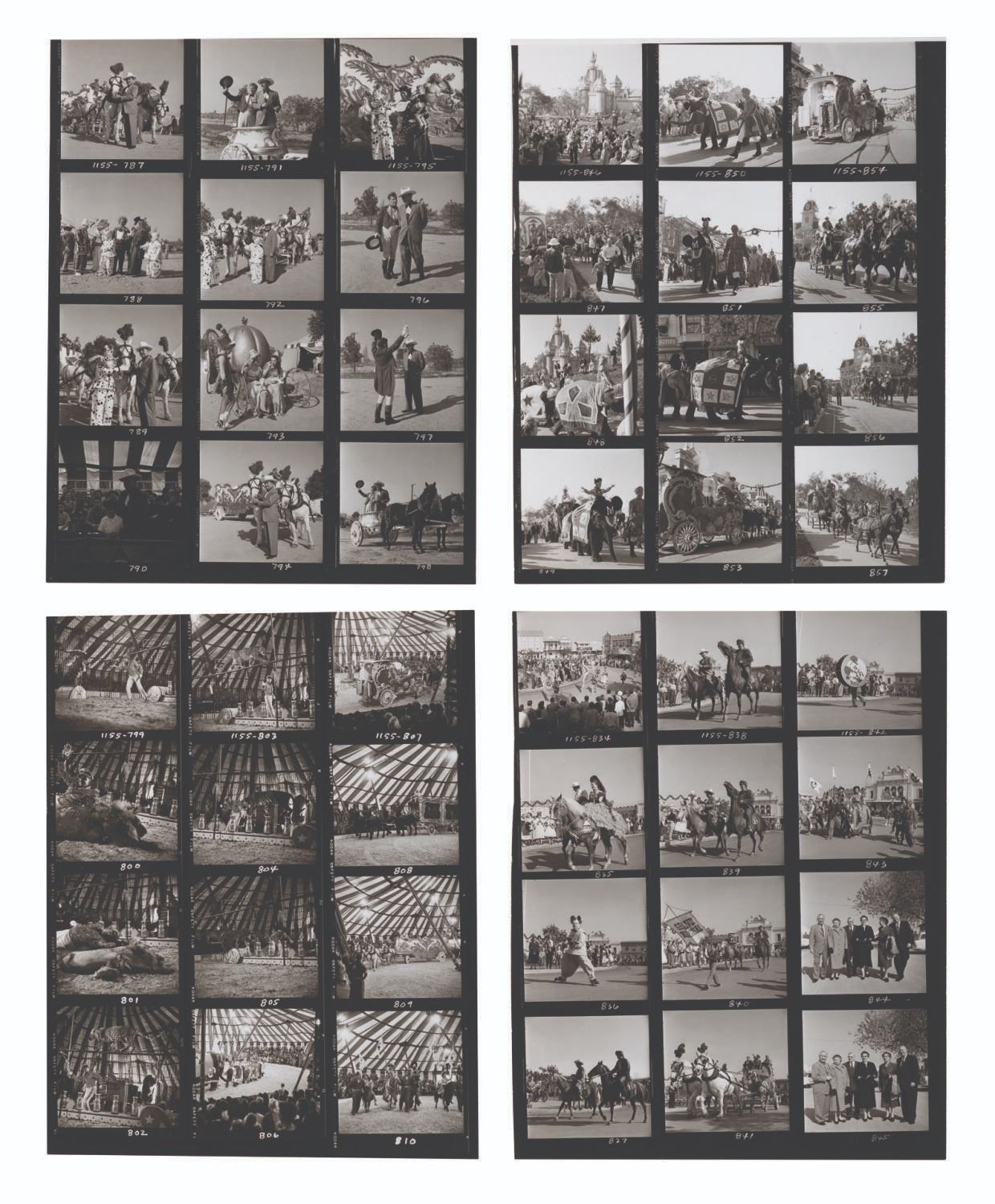 (Disneyland, 1955) A collection of four contact sheets showing 48 photos of the Mickey Mouse Club Circus opening day parade and performance. On November 24, 1955 - Thanksgiving Day - the Circus came to Disneyland with a parade led by Walt Disney and Fess Parker (Davy Crockett), up Main Street and past Sleeping Beauty Castle to the big top in Holidayland. Printed directly on the paper from 48 2.25" x 2.25" negatives, these sheets present highly detailed images of the parade, Walt and Jimmie Dodd preparing for the show, and Professor Keller and his Jungle Cats performing. Since contact sheets show the entire square negative, even familiar images that were produced from these show much more than the usual 8" x 10" publicity photo reveals. Measuring 8" x 10" each, the contact sheets are in very good condition with light handling wear, including scratches and typical curling from age.