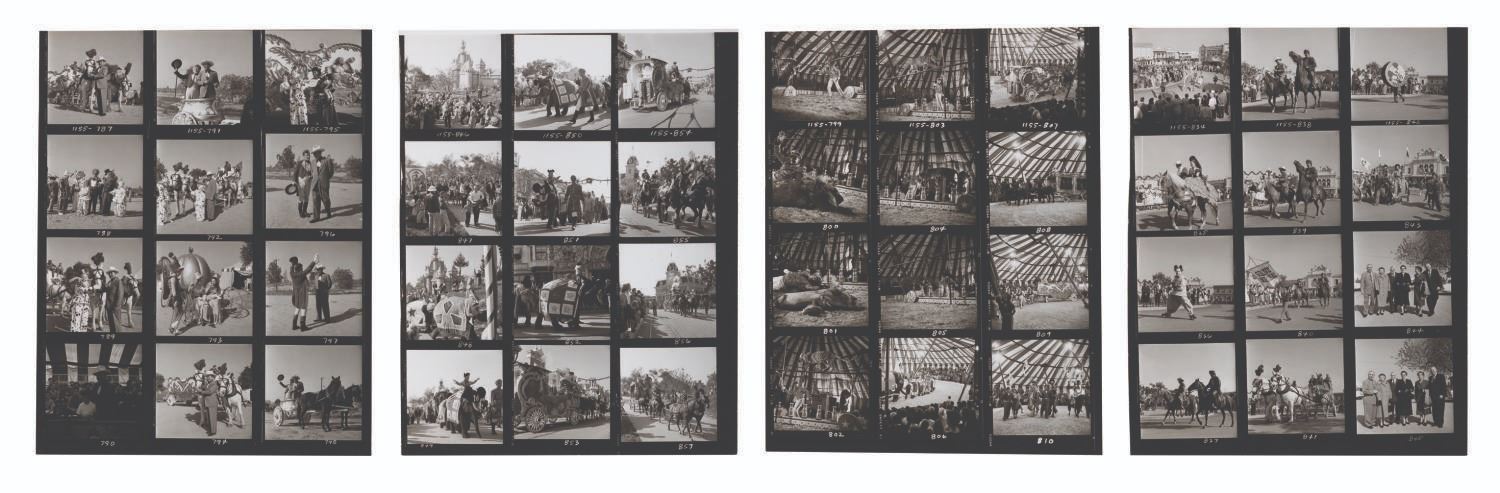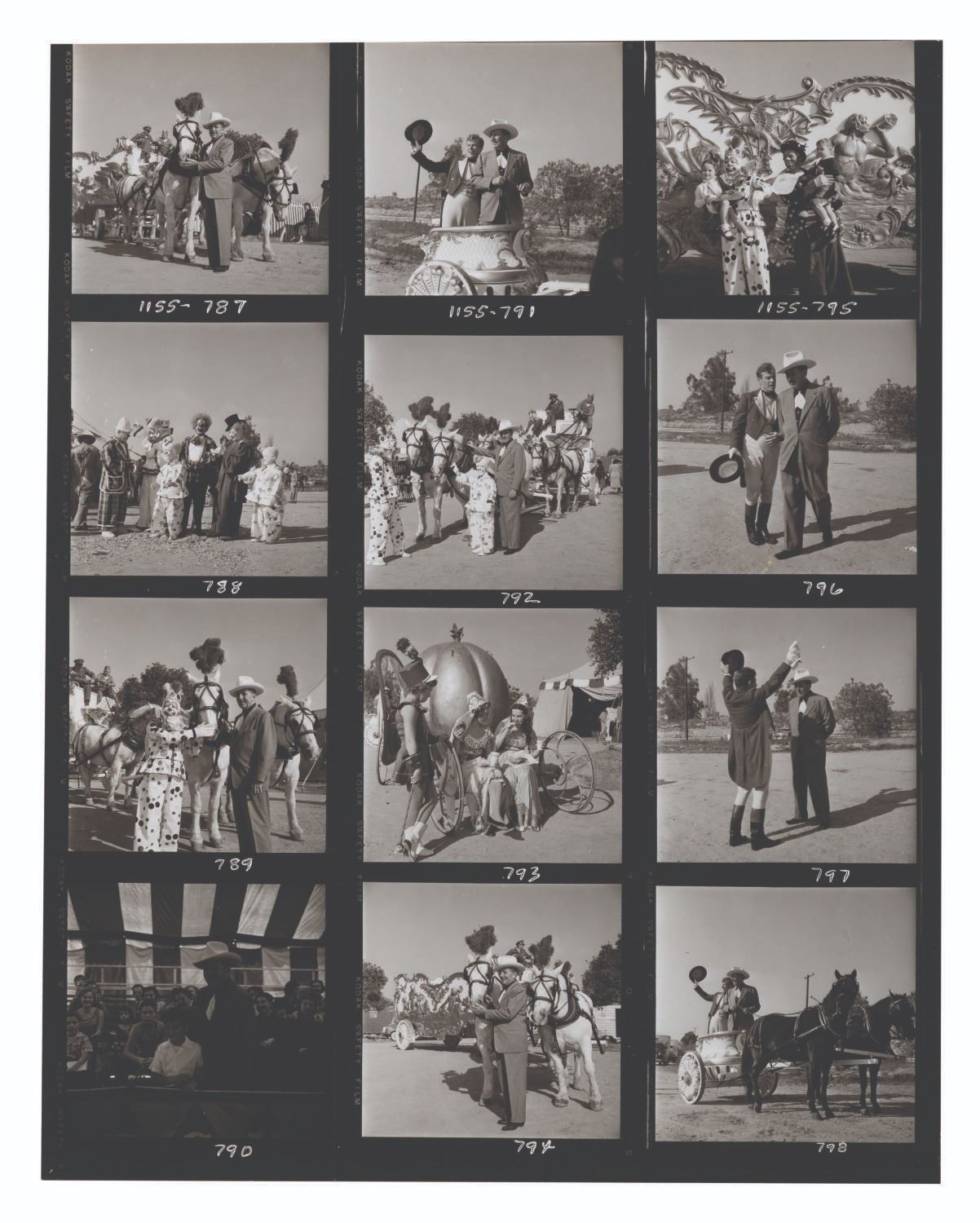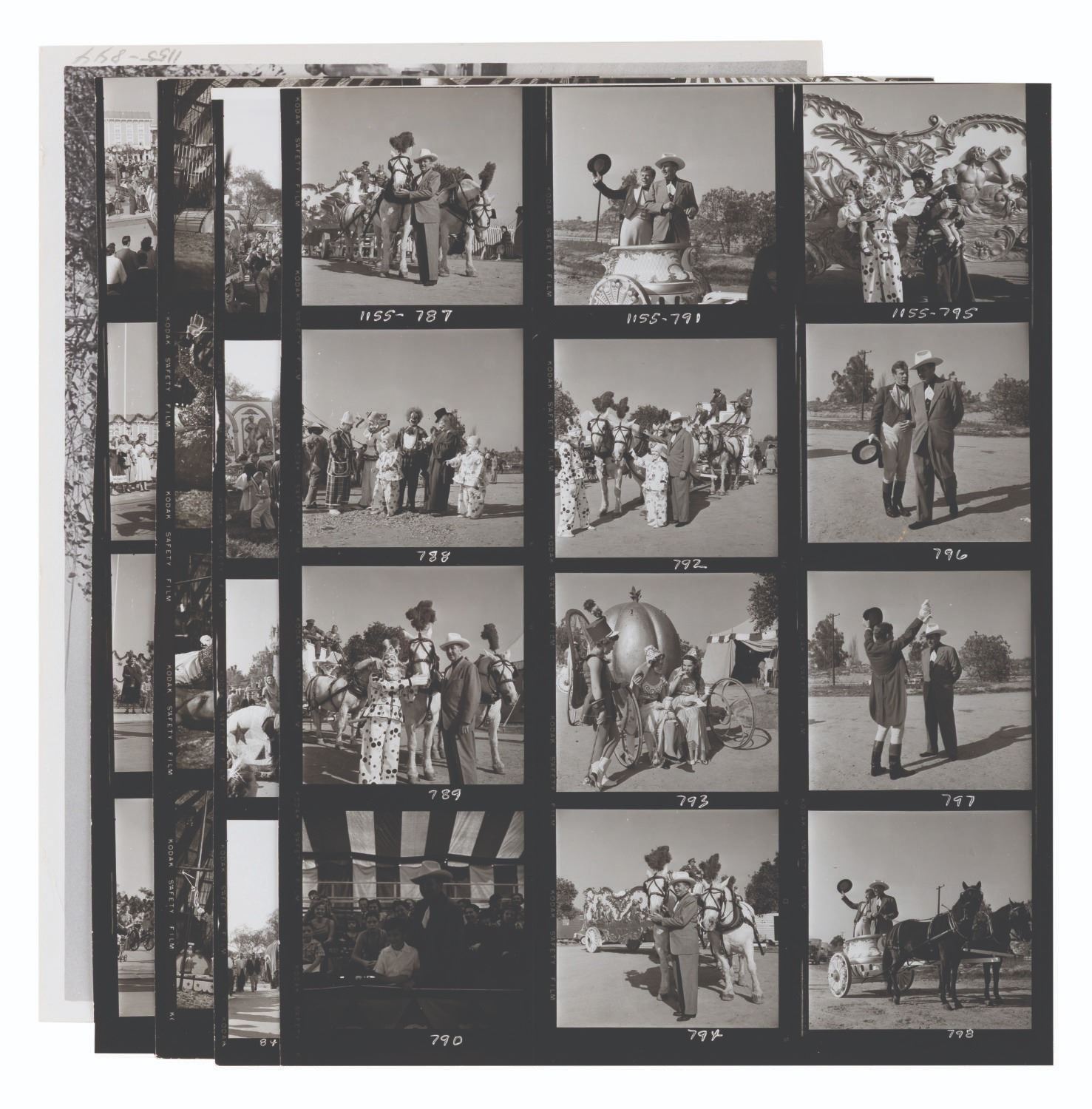 (Disneyland, 1955) A collection of four contact sheets showing 48 photos of the Mickey Mouse Club Circus opening day parade and performance. On November 24, 1955 - Thanksgiving Day - the Circus came to Disneyland with a parade led by Walt Disney and Fess Parker (Davy Crockett), up Main Street and past Sleeping Beauty Castle to the big top in Holidayland. Printed directly on the paper from 48 2.25" x 2.25" negatives, these sheets present highly detailed images of the parade, Walt and Jimmie Dodd preparing for the show, and Professor Keller and his Jungle Cats performing. Since contact sheets show the entire square negative, even familiar images that were produced from these show much more than the usual 8" x 10" publicity photo reveals. Measuring 8" x 10" each, the contact sheets are in very good condition with light handling wear, including scratches and typical curling from age.