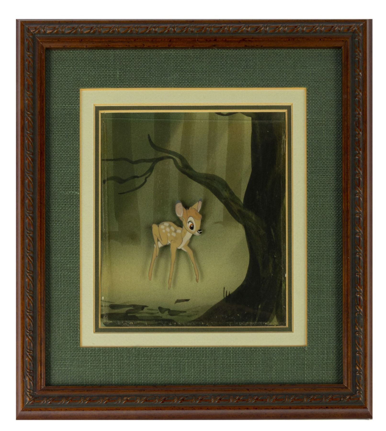 (Walt Disney Studios, 1942) An original production cel of Bambi that was used in the creation of the similarly titled animated film. This cel was originally prepared by Courvoisier Galleries and is placed over a hand-painted Courvoisier background. The cel has a character size of 2.25"x1.5" and is displayed in a 10.5"x10" frame. The cel has not been examined out of frame, however it appears to be in good condition overall with some slight curving to the cel which is common for cels from this period. The cel may need to be slightly re-aligned within the mat due to the curving.