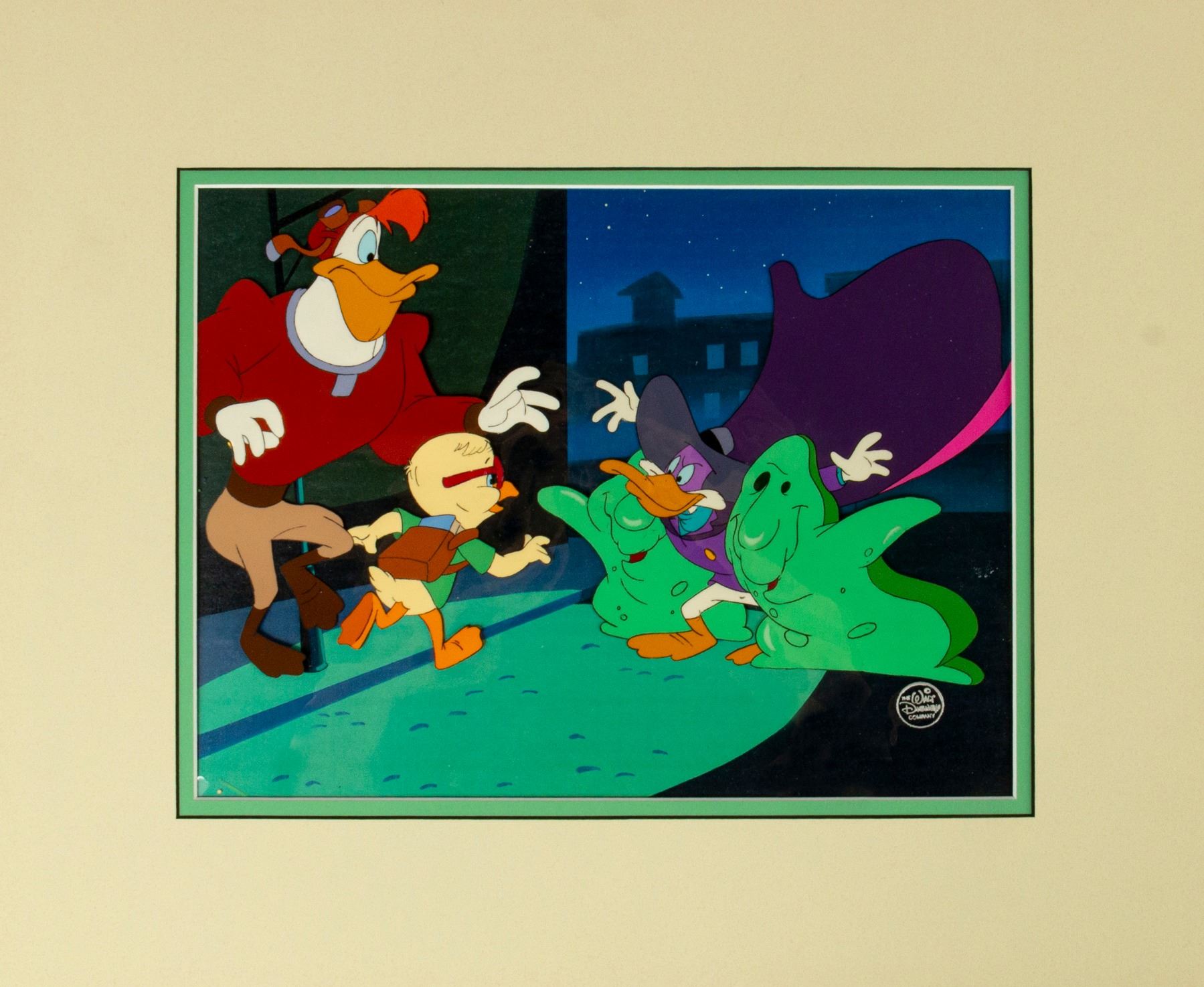 (Walt Disney Studios, c.1991) An original production cel of Darkwing Duck, Launchpad McQuack, and Honker that was used in the creation of the animated series Darkwing Duck. The hand-painted cel set-up features Launchpad and Honker on the top cel layer, and Darkwing and the two green characters on the bottom cel layer. The Walt Disney Company seal is in the bottom-right corner, and the cels have been placed over a reproduction printed background for display. The cels have an image size of 9"x11.75" within their 15"x17.75" mat frame. The condition is good overall with some small amounts of wear near Darkwing's face.
