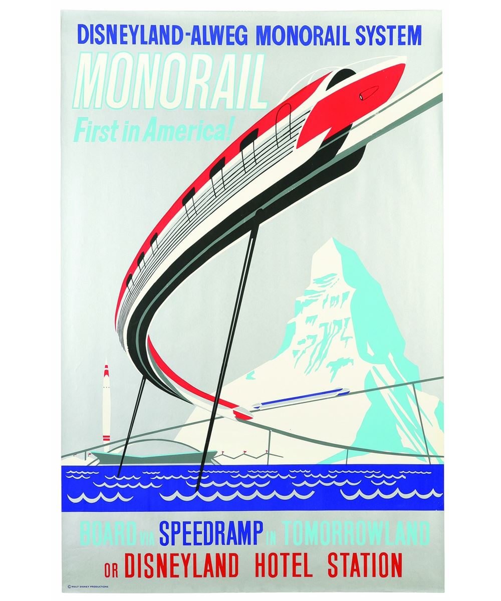 (Disneyland, 1961) Original hand-silkscreened poster for the Disneyland Alweg Monorail attraction. The Paul Hartley designed poster measures 54”x36” and is in very good to fine condition with some edge wear and a 2” band of age toning across the top edge.