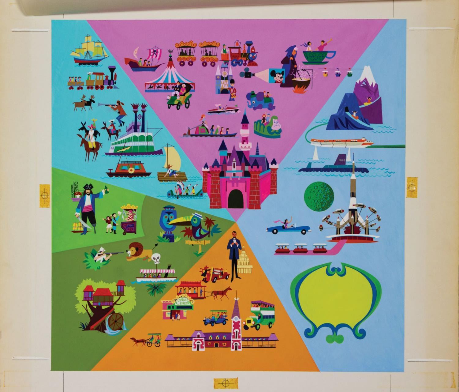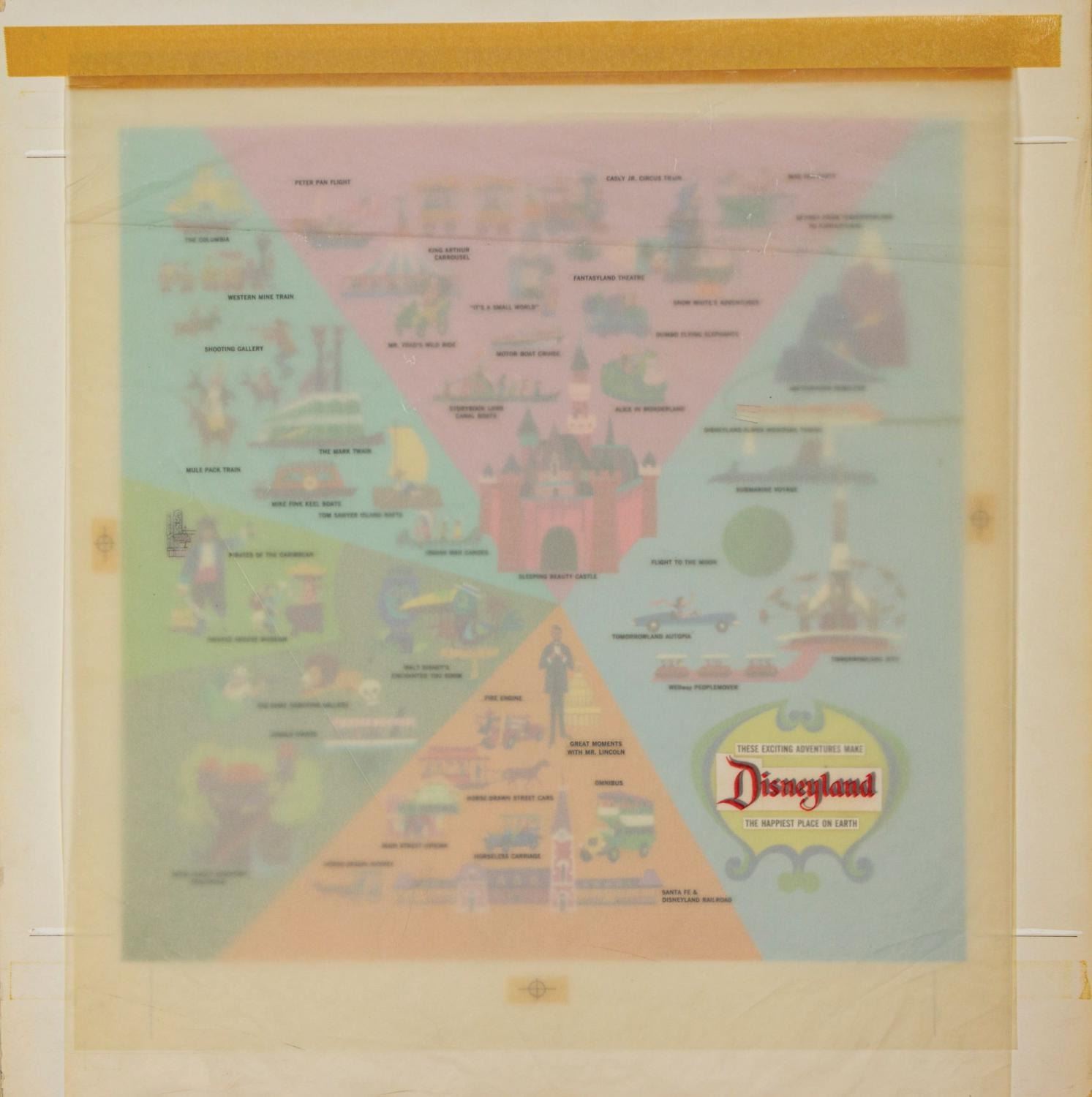 (Disneyland, c.1967) An original painting depicting a stylized map of Disneyland and its many attractions. This artwork was created at the time of the debut of Pirates of the Caribbean, and represents the attractions available that year, which include It's a Small World, the Enchanted Tiki Room, Alice in Wonderland, Mr. Toad's Wild Ride, and many other fan-favorites. Accomplished in acrylic on art board, the vibrant artwork has two vellum overlays with the text for the attraction titles on one layer, and the red "Disneyland" text on the top-most layer. The artwork has an image size of 16.75"x16.75" on the 23.25"x22" board. The condition is very fine with some wear at the edges of the board.