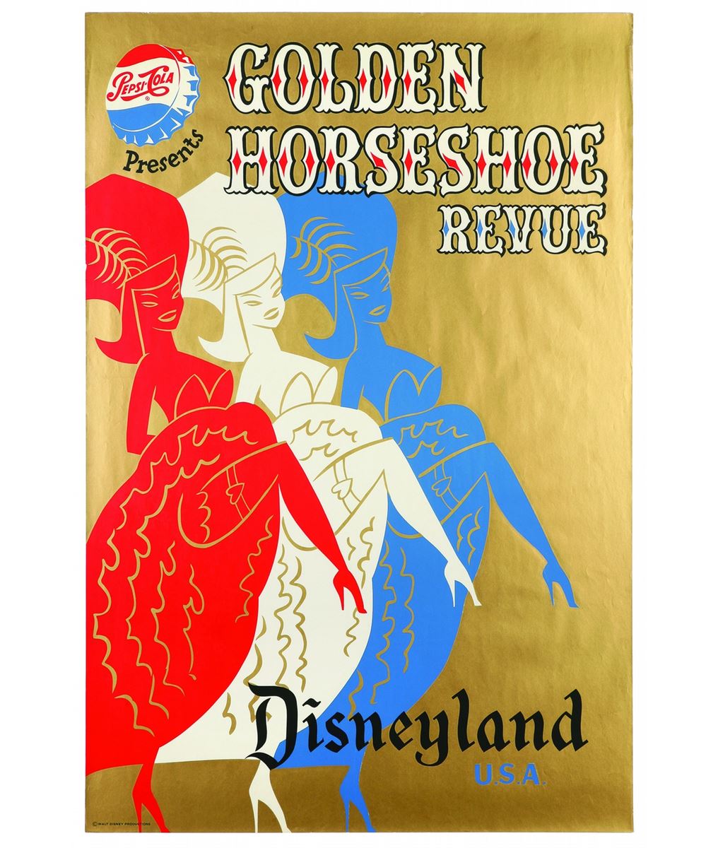 (Disneyland, 1961) Original hand-silkscreened poster for the Disneyland Golden Horseshoe Review Attraction. This particular poster was the second version of the Bjorn Aronson designed poster and was screened in the early 1960s. It features the Pepsi-Cola logo and "Disneyland" across the bottom. Measuring 54" x 36" and in very good condition. There are a few very light dings and creases on upper corners and sides including a 3/8" tear near upper right corner. Also a 1" crease across the upper right corner is starting to break away.