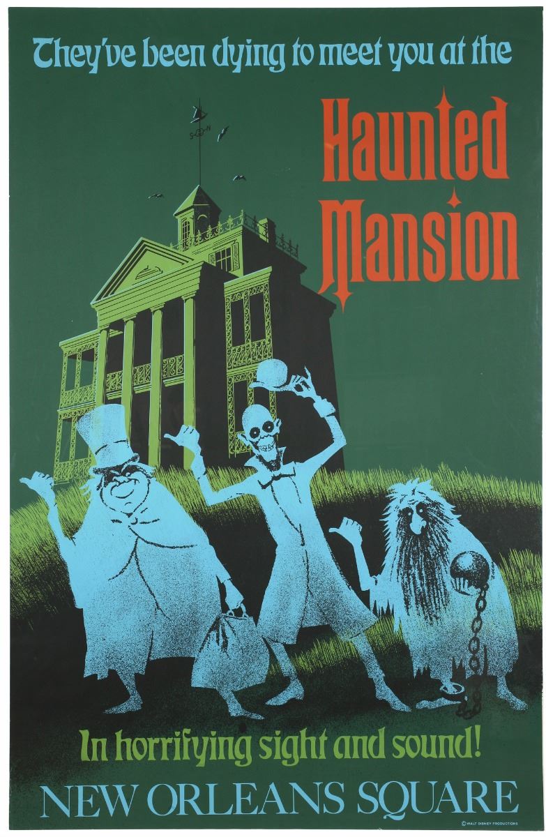 (Disneyland, 1969) Original hand-silkscreened poster for the "Haunted Mansion" attraction at Disneyland. Designed by Ken Chapman and Marc Davis, it is one of the most popular and collectible of the Disneyland attraction posters. Measures 54"x36" and is in very good condition with minor edge wear. The poster in drymounted to a foam-core backing.